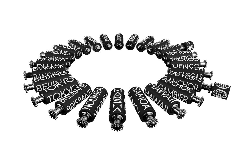หน้าปัด: ลูกกลิ้ง 26 ลูก (ลูกกลิ้งชื่อเมือง 24 ลูก ลูกกลิ้งบอกช่วงเวลา 1 ลูก ลูกกลิ้งเวลาสากล 1 ลูก)