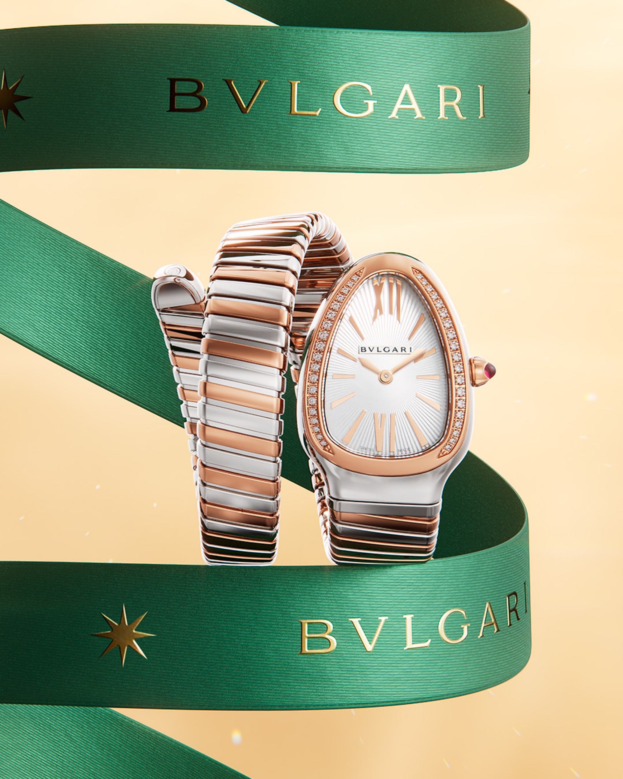 ในส่วนของคอลเลกชันเรือนเวลา นาฬิกาของ Bvlgari ถูกจัดวางให้เป็นศูนย์กลางของการมอบของขวัญอันเป็นอมตะ โดยสะท้อนถึงการผสมผสานงานฝีมืออิตาลี (Italian Glamour) เข้ากับความกล้าหาญในการออกแบบ ซึ่งความเจิดจรัสของงานออกแบบที่โดดเด่นทำให้เรือนเวลาเหล่านี้กลายเป็นของขวัญที่เหมาะสมที่สุดในการถ่ายทอดความรู้สึกอย่างเต็มเปี่ยม สำหรับฤดูกาลแห่งการมอบของขวัญนี้ Bvlgari ได้เน้นย้ำถึงความเป็นที่สุดของสามคอลเลกชันนาฬิกาอันเป็นเอกลักษณ์ อาทิ