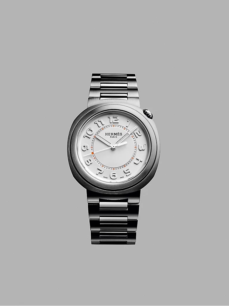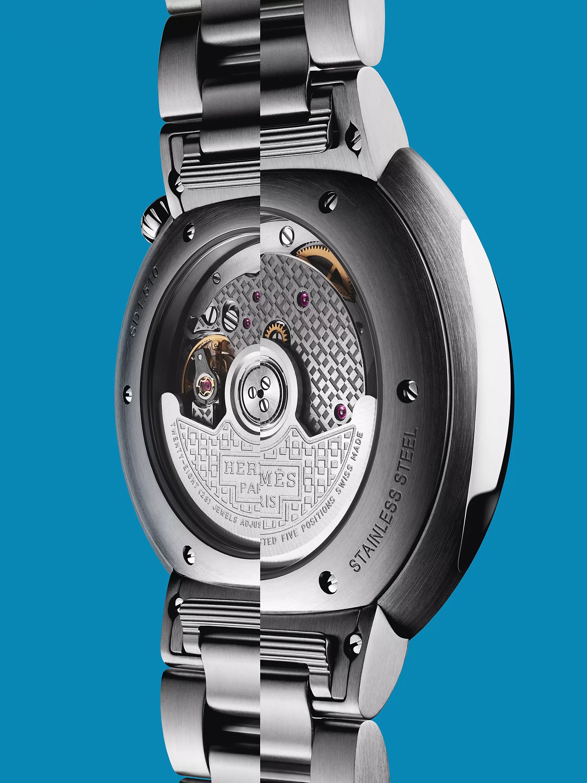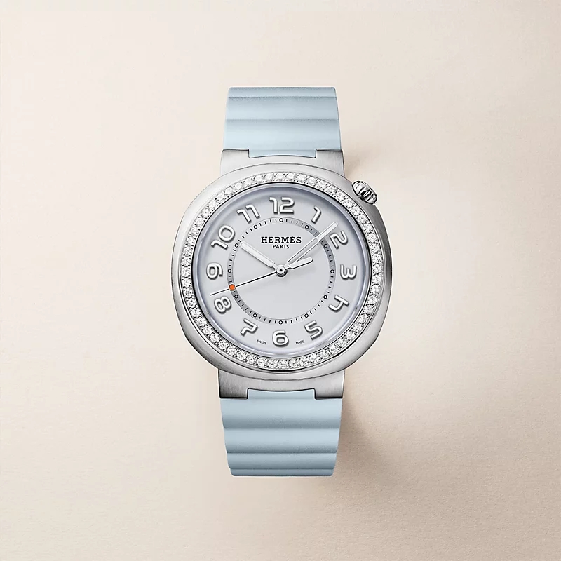 - หน้าปัดแห่งท้องนภา: สีฟ้าอ่อนโอปอล (Light Blue Opaline) ที่ได้รับแรงบันดาลใจจากความสดชื่นของท้องฟ้า (Azure Freshness) เป็นสีที่มอบความเบาสบายและร่วมสมัย ตัวเลขอารบิกแบบนูนใช้ฟอนต์อันเป็นเอกลักษณ์ของแอร์เมสและเคลือบสารเรืองแสงอย่างสมบูรณ์
