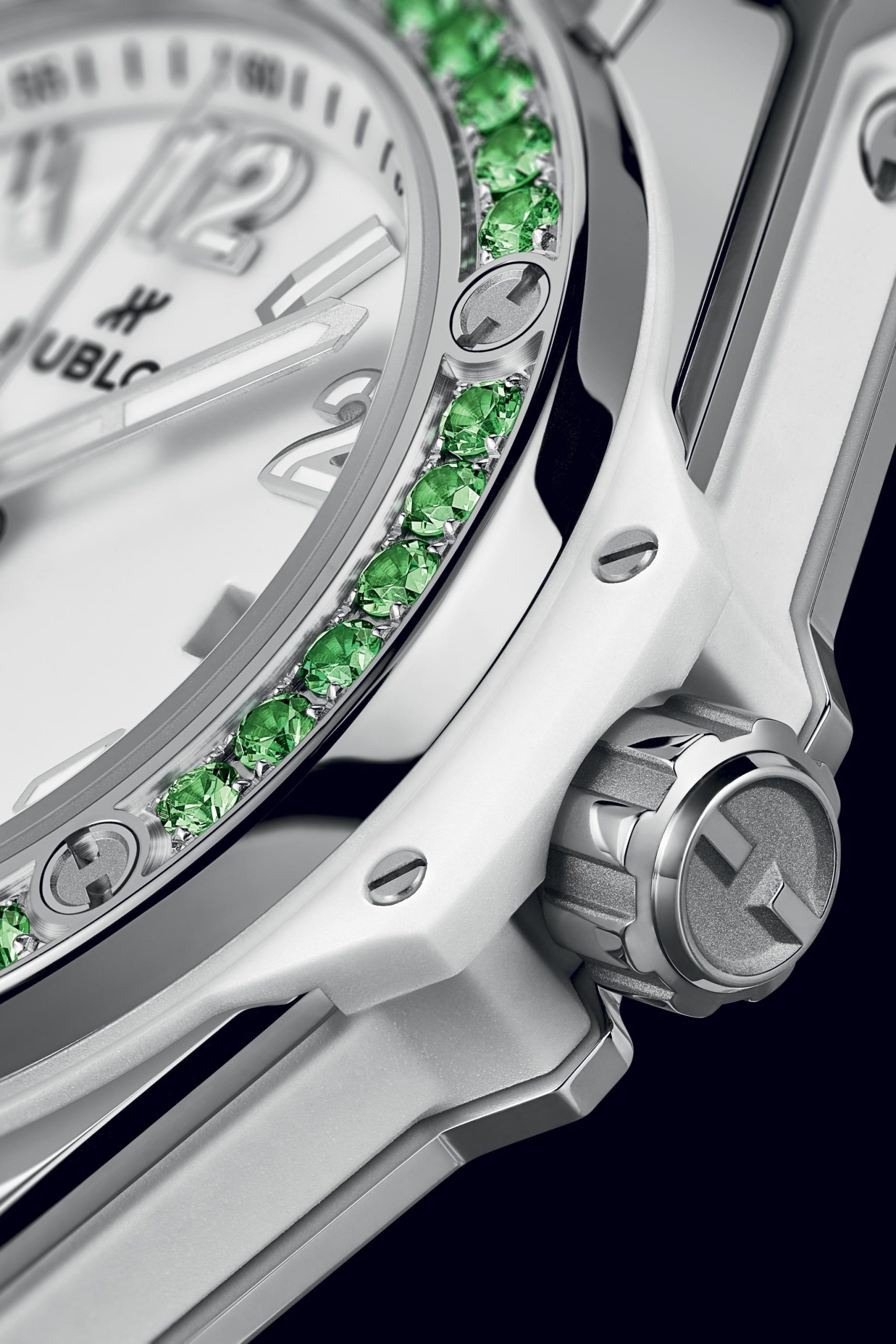 นาฬิกา Big Bang One Click Joyful โดดเด่นด้วยตัวเรือนขนาดกะทัดรัด 33 มิลลิเมตร ที่สะท้อนความเป็นผู้หญิงอย่างแท้จริง หัวใจหลักของคอลเลกชันนี้คืออัญมณีล้ำค่าที่ประดับอยู่บนขอบตัวเรือน ซึ่งเปล่งประกายอย่างน่าหลงใหล และยังสามารถกระตุ้นความรู้สึกและบ่งบอกถึงตัวตนของผู้สวมใส่ การเลือกและตกแต่งอัญมณีเหล่านี้เป็นขั้นตอนที่ซับซ้อนและต้องใช้ความเชี่ยวชาญอย่างสูง โดยช่างฝีมือจะคัดเลือกอัญมณีที่มีคุณภาพ สี และขนาดที่สม่ำเสมอ แล้วจึงตัด ขัดเงา และนำมาจัดเรียงทีละเม็ดบนขอบตัวเรือนด้วยเทคนิคดั้งเดิม อัญมณีแต่ละชนิดถูกเลือกสรรมาอย่างพิถีพิถันเพื่อสร้างสรรค์ความโดดเด่นให้กับแต่ละรุ่น ได้แก่ สปินเอลสีแดง แซฟไฟร์สีส้ม แซฟไฟร์สีชมพู โทปาซสีน้ำเงิน และทซาโวไรท์สำหรับรุ่นสีเขียว