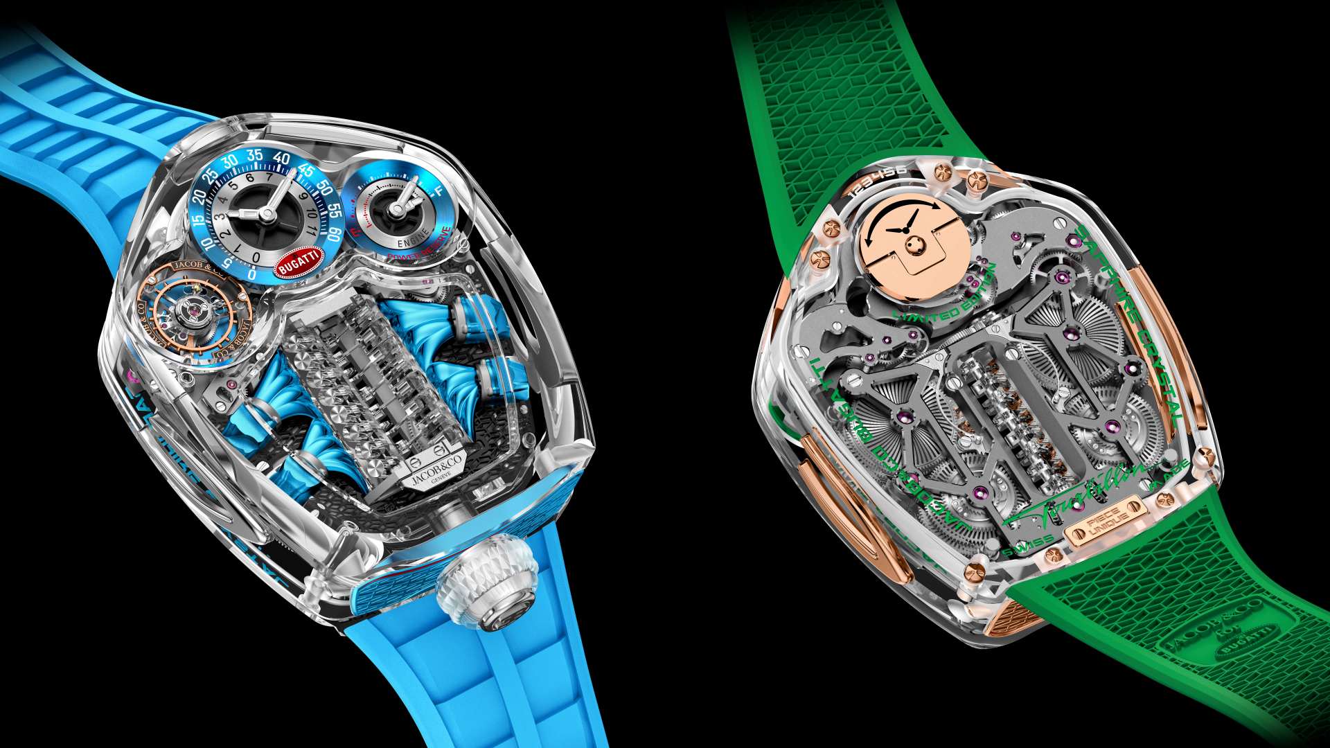 - ซ้าย: ฟลายอิงทูร์บิญองแบบ 30 วินาที ซึ่งหมุนเร็วที่สุดเท่าที่ Jacob & Co. เคยทำมา เพื่อสดุดีความเร็วของ Bugatti