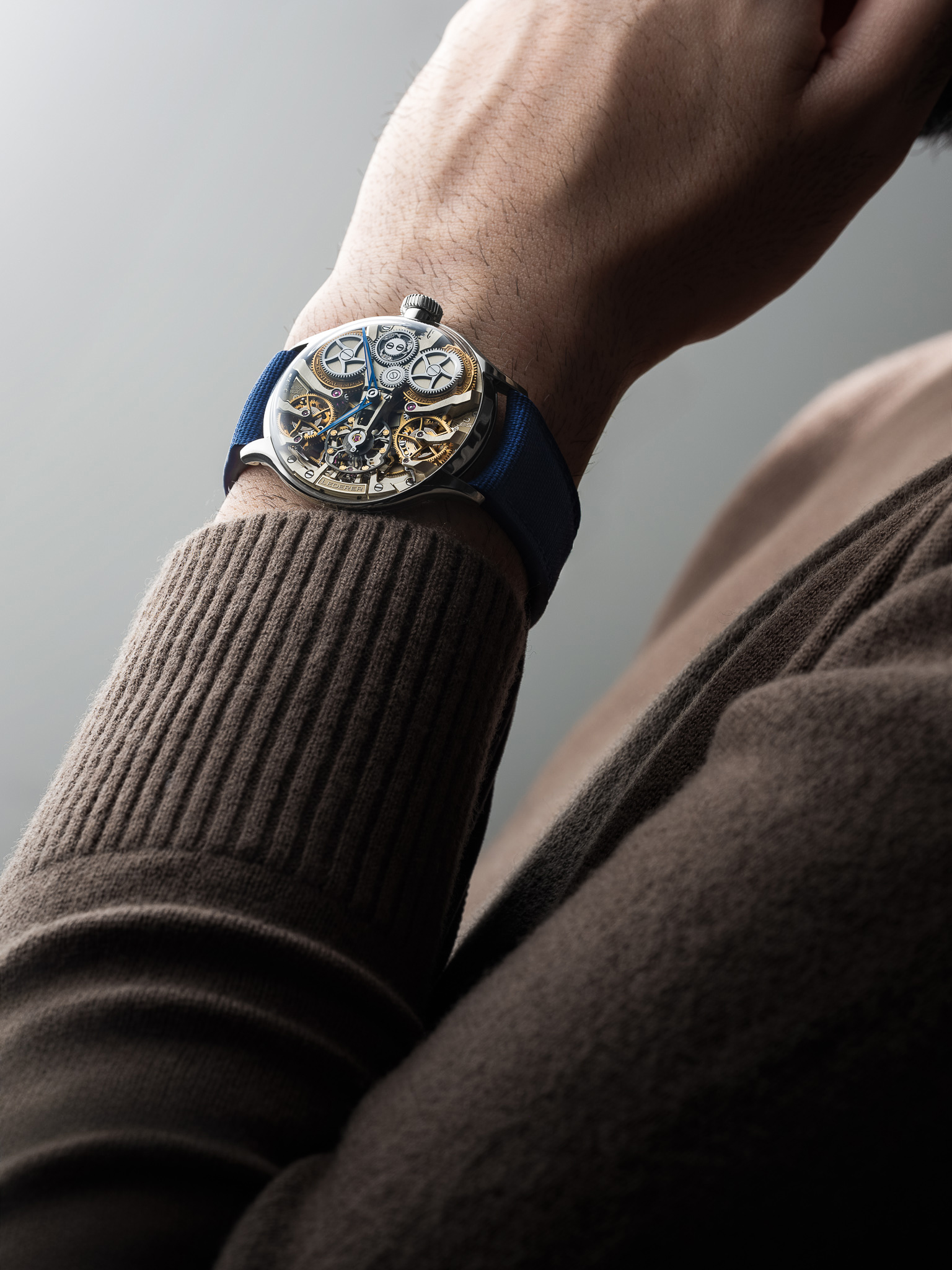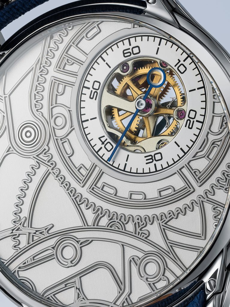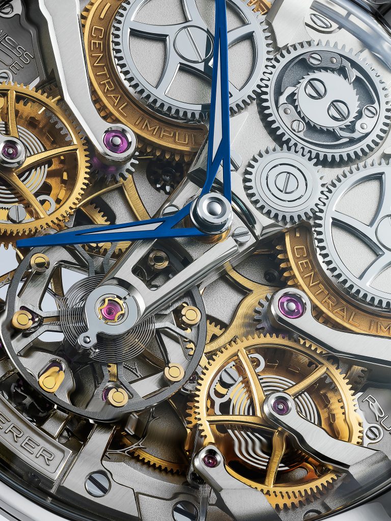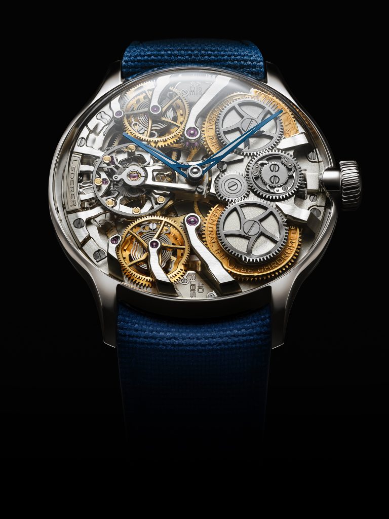 แทนที่จะซ่อนกลไกขับเคลื่อนไว้อย่างมิดชิดในตัวเรือนแบบทึบ หรือเผยโฉมให้เห็นผ่านฝาหลังแบบใส Lederer ไม่ได้เลือกทำเช่นนั้น แต่กลับเลือกที่จะอวดโฉมทุกองคาพยพที่ขับเคลื่อนนาฬิการุ่นนี้ผ่านกระจกคริสตัลแซฟไฟร์ใสแจ๋วทั้งด้านหน้าและด้านหลัง ทำให้เราได้ชื่นชมทุกจังหวะในการเคลื่อนไหวของชิ้นส่วนต่างๆ ในทุกมุม ไม่ว่าจะเป็นชุดเฟือง สปริง โดยเฉพาะ remontoir คู่ที่คอยควบคุมการจ่ายพลังงานให้เสถียรในทุกจังหวะอันเป็นความเชี่ยวชาญของ Lederer ทุกชิ้นส่วนล้วนสอดประสานกันอย่างพร้อมเพรียงราวกับวงซิมโฟนีที่มีไวทยากรณ์คอยกำกับให้ทุกตัวโน้ตบรรเลงได้อย่างถูกต้องและสอดคล้องกัน สังเกตได้จากจังหวะการเคลื่อนตัวของเข็มวินาทีบนหน้าปัดย่อยด้านหลังตัวเรือนที่สอดรับกับจังหวะการของ remontoir ได้อย่างเหมาะเจาะ สำหรับคนที่หลงใหลไปจนถึงคลั่งไคล้ในกลไกแล้ว การได้เฝ้ามองดูการเคลื่อนไหวที่เป็นหนึ่งเดียวช่างเป็นภาพที่น่าพึงพอใจและทำให้เพลิดเพลินทุกครั้งที่ได้เห็น