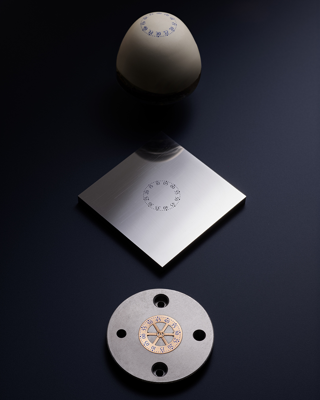 - แผ่นดิสก์บอกเวลา: ทองเหลืองขัดซาตินด้วยมือ เคลือบ 4N กัลวานิก ตัวเลขอารบิก สีน้ำเงิน หรือทองเหลืองขัดซาตินด้วยมือ เคลือบโรเดียม