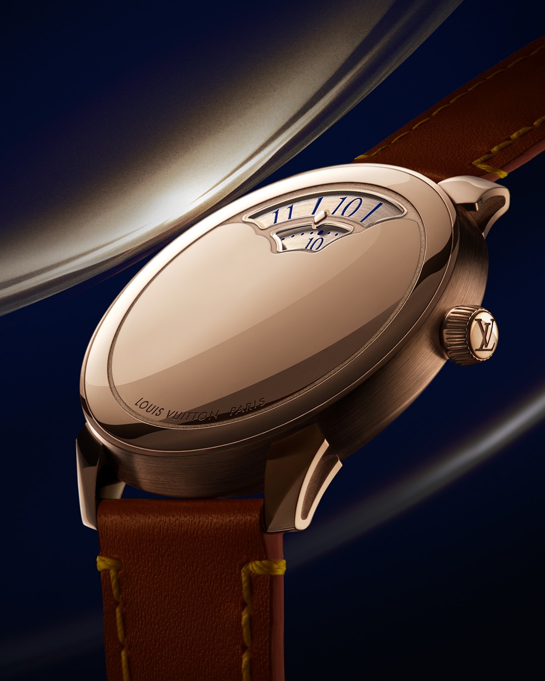 ความใส่ใจในรายละเอียดของเมซงยังแสดงออกผ่านรูปทรงของหน้าต่างแสดงค่าเวลาทั้งสองช่อง ซึ่งสำหรับสาวกนาฬิกาหน้าต่างรูปทรงนี้อาจดูเหมือนรูปแบบที่พบเห็นได้ทั่วไปในนาฬิกาจำพวก jump hour แต่สำหรับเมซงที่ผูกพันกับการเดินทางและประวัติศาสตร์ยาวนานอย่าง Louis Vuitton แล้ว รูปทรงโค้งนี้มาพร้อมกับเรื่องราวอันทรงคุณค่า เพราะมันได้แรงบันดาลใจมาจากรูปแบบการตกแต่งภายในบ้านพักของครอบครัว Louis Vuitton ในอาส์นิแยร์ และสถานที่สืบทอดมรดกทางวัฒนธรรมด้านงานช่างฝีมือของเมซง และยังเป็นรูปทรงโค้งที่ชวนให้นึกถึงความงามของปรากฏการณ์ธรรมชาติ เพราะถ้าสังเกตเส้นขอบรอบนอกที่ล้อมกรอบหน้าต่างไว้ เราจะเห็นว่าแลดูคล้ายกับกลุ่มก้อนเมฆ แต่ละครั้งที่ตัวเลขกระโดดเปลี่ยนตำแหน่งแทนค่าเวลาที่ผ่านเลยไปจึงเป็นเหมือนลำแสงอาทิตย์ที่ลอดผ่านกลุ่มเมฆในช่วงเวลาที่แตกต่างกัน