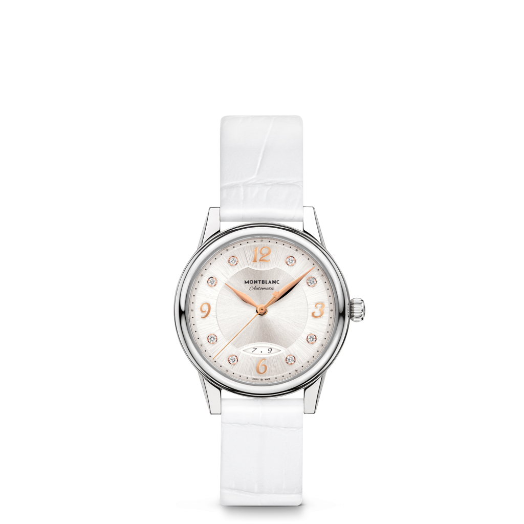 ในส่วนของนาฬิกา Montblanc Bohème Automatic Date 30mm โดดเด่นด้วยดีไซน์ที่ดูละมุนและละเอียดอ่อน หน้าปัดสีเงินขัดเงาประดับด้วยหลักชั่วโมงเพชรและเลขอารบิกสีทองกุหลาบ ทำให้ดูหรูหราแต่ไม่ฉูดฉาด ที่น่าสนใจคือวงแหวนหน้าปัดใช้เทคนิคการประทับลาย filet d’étoiles ซึ่งเป็นลายที่ได้แรงบันดาลใจจากการเคลื่อนไหวของดวงดาว และมาพร้อมสายหนังจระเข้สีขาวที่สามารถเปลี่ยนได้ ทำให้ปรับเปลี่ยนลุคได้ง่ายขึ้น