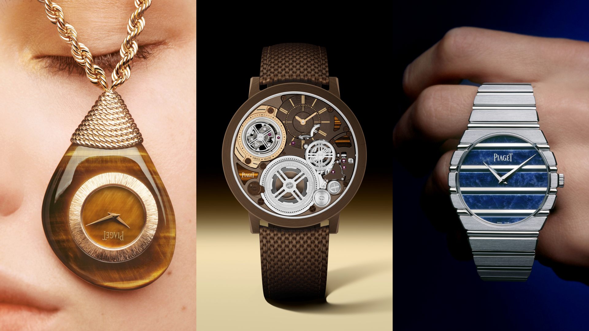ความเหนือชั้นที่เป็นหัวใจหลักคือการแกะสลักหินสี (Ornamental Stones) ทั้งชิ้นเพื่อทำเป็นจี้ห้อยคอ โดยที่ตัวเรือน หน้าปัด และโครงสร้างทั้งหมดถูกสร้างขึ้นจากหินก้อนเดียวแบบไร้รอยต่อ มีให้เลือก 3 ชนิดคือ หินตาเสือ (Tiger’s Eye) เวอไดต์ (Verdite) และปีเตอร์ไซต์ (Pietersite) ซึ่งแต่ละชนิดให้แสงเงาและลวดลายที่เป็นเอกลักษณ์เฉพาะตัว ช่างฝีมือต้องใช้วิธีขุดเจาะเนื้อหินจากภายในเพื่อวางกลไกนาฬิกาลงไปแล้วผนึกไว้อย่างมิดชิด ก่อนจะนำไปแขวนกับสายโซ่ทองคำถักมือที่เป็นงานคราฟต์เฉพาะตัวของ Piaget ซึ่งให้ความพริ้วไหวและเล่นกับแสงได้อย่างน่าอัศจรรย์