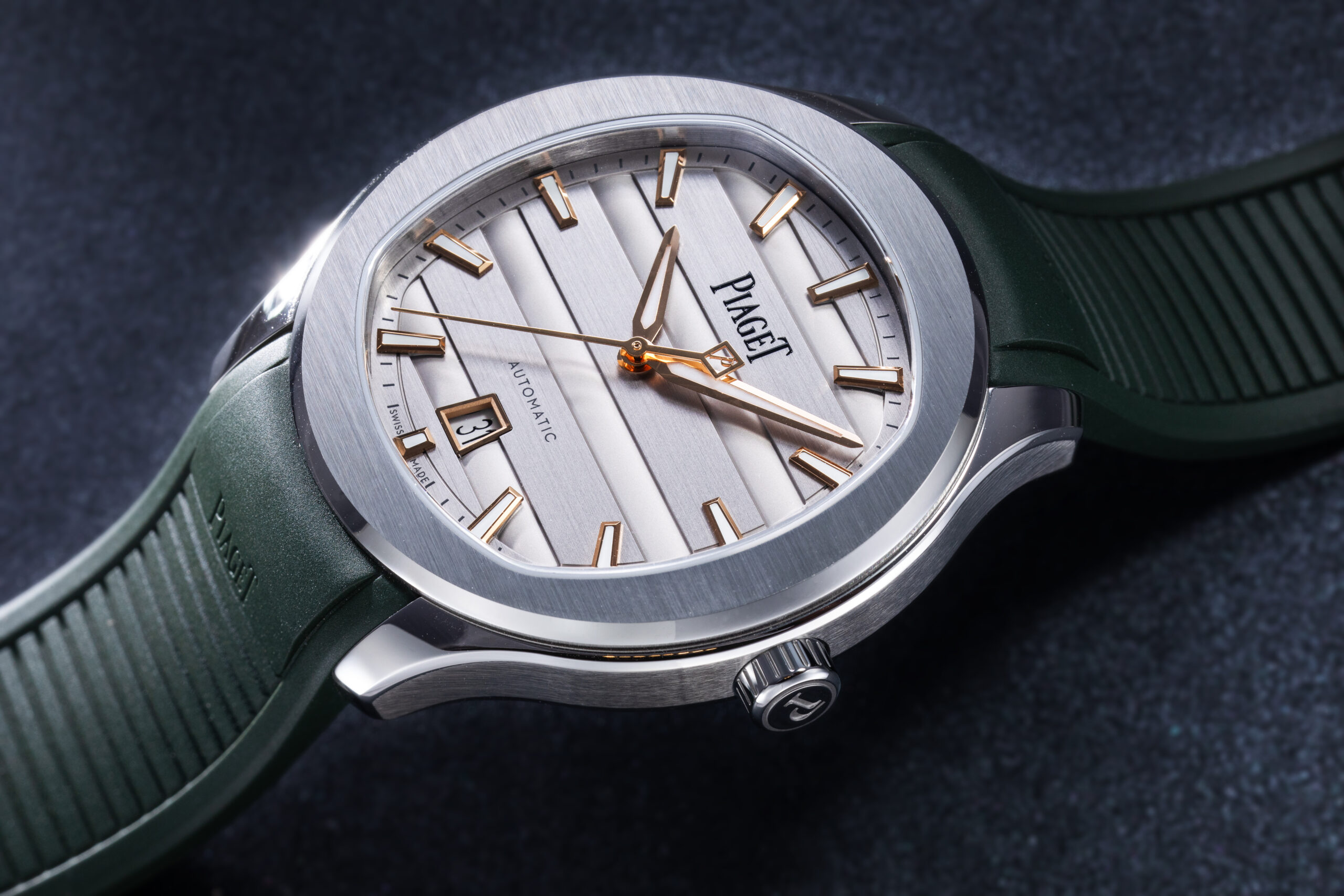 นาฬิกา Piaget Polo Signature (Ref. G0A51012) ตัวเรือนเหล็ก นำเสนอดีไซน์ที่เรียบหรูและเหมาะกับการใช้งานในชีวิตประจำวัน ด้วยลวดลาย gadroon จับคู่กับหน้าปัดสีเงินและสายยางสีเขียว (Revolution©)
