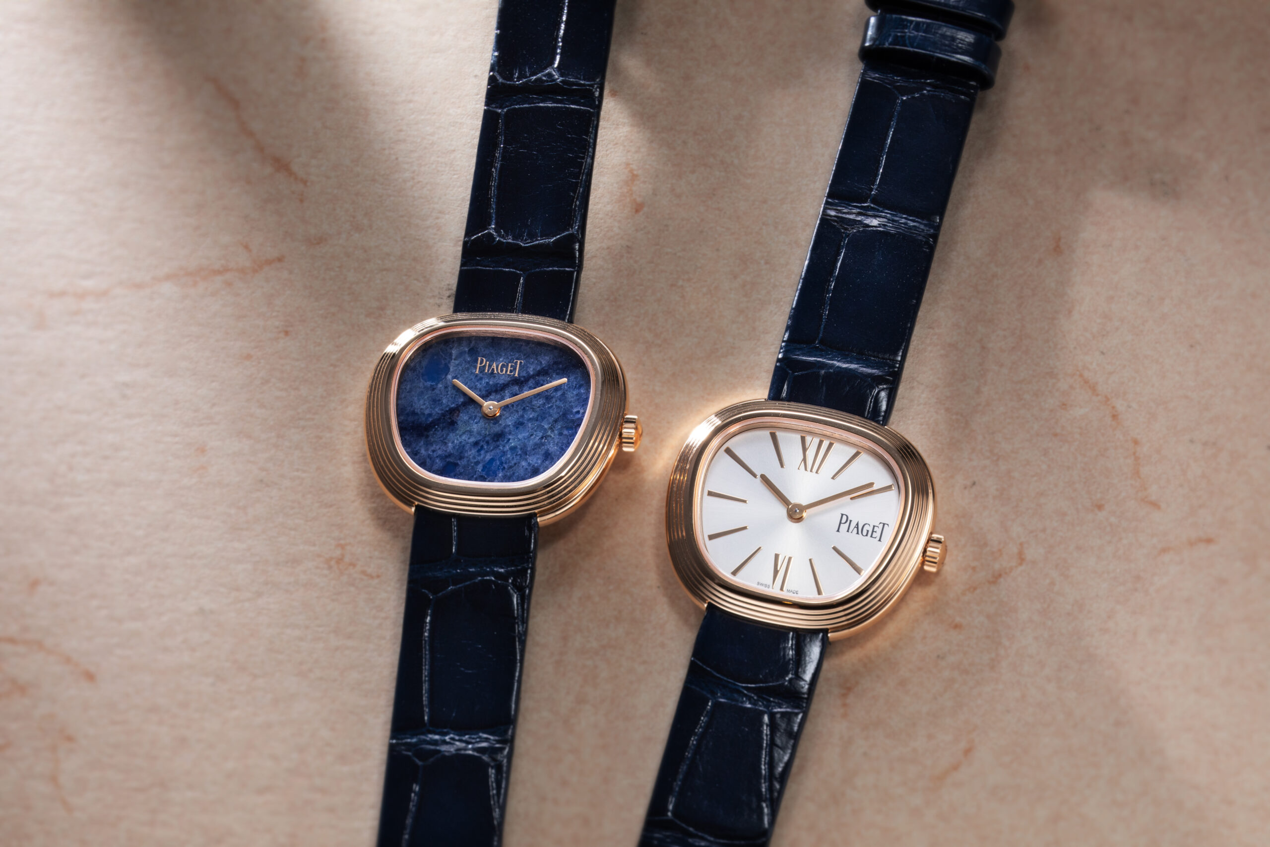 นาฬิกา Piaget Sixtie (29 มม.) ตัวเรือนโรสโกลด์ 18K หน้าปัดควอตซ์สีน้ำเงิน สายหนังจระเข้สีน้ำเงิน และนาฬิกา Piaget Sixtie (29 มม.) ตัวเรือนโรสโกลด์ 18K หน้าปัดสีเงินขัดเงาแบบซาติน สายหนังจระเข้สีน้ำเงินเข้าชุดกัน (Revolution©)