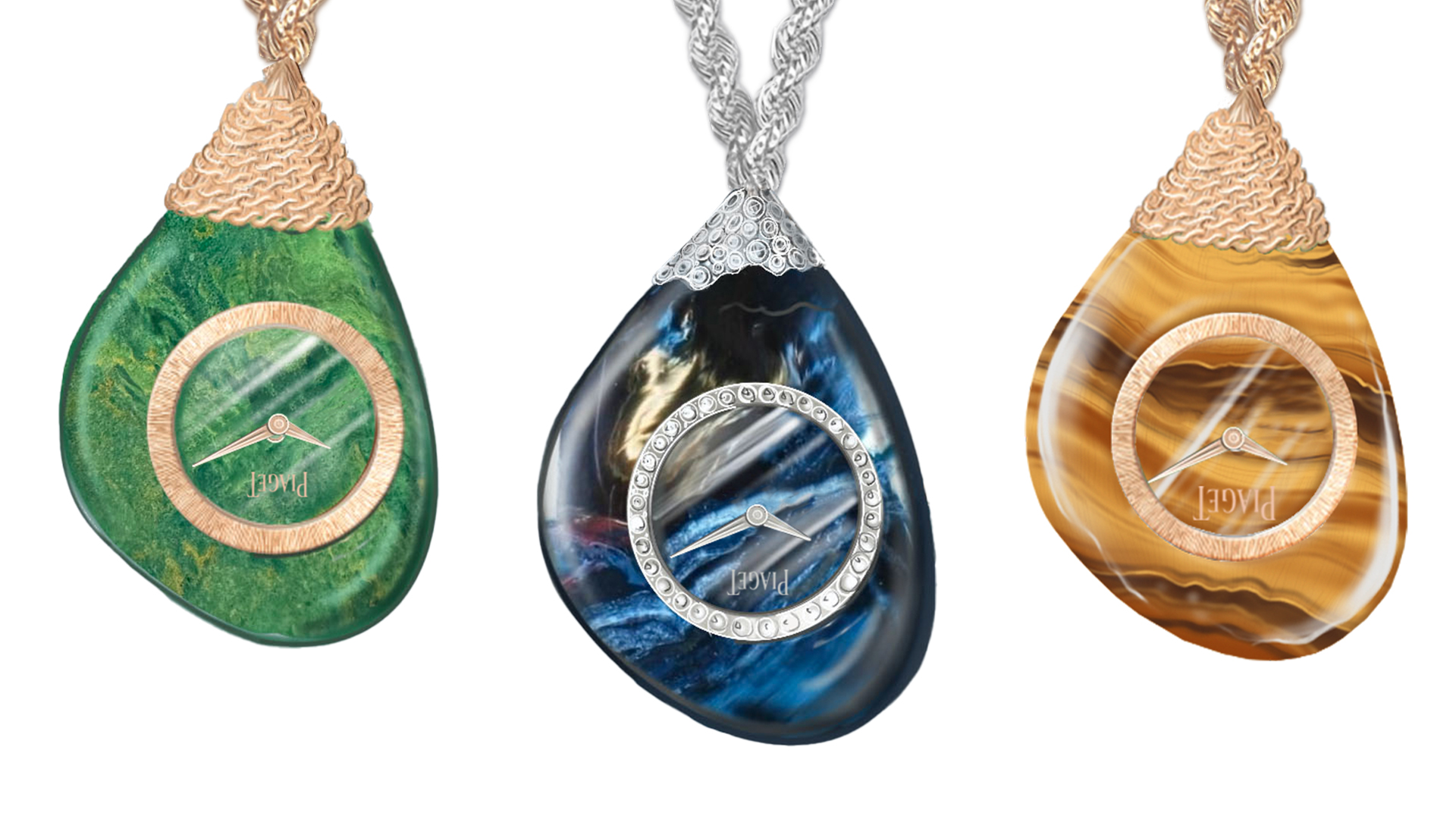 สร้อยคอ Piaget Swinging Pebbles ทำจากหินเวอร์ไดต์ หินปีเตอร์ไซต์ และหินตาเสือ แต่ละเส้นแกะสลักจากหินประดับชิ้นเดียว และห้อยจากโซ่ทองคำที่ทำด้วยมือ