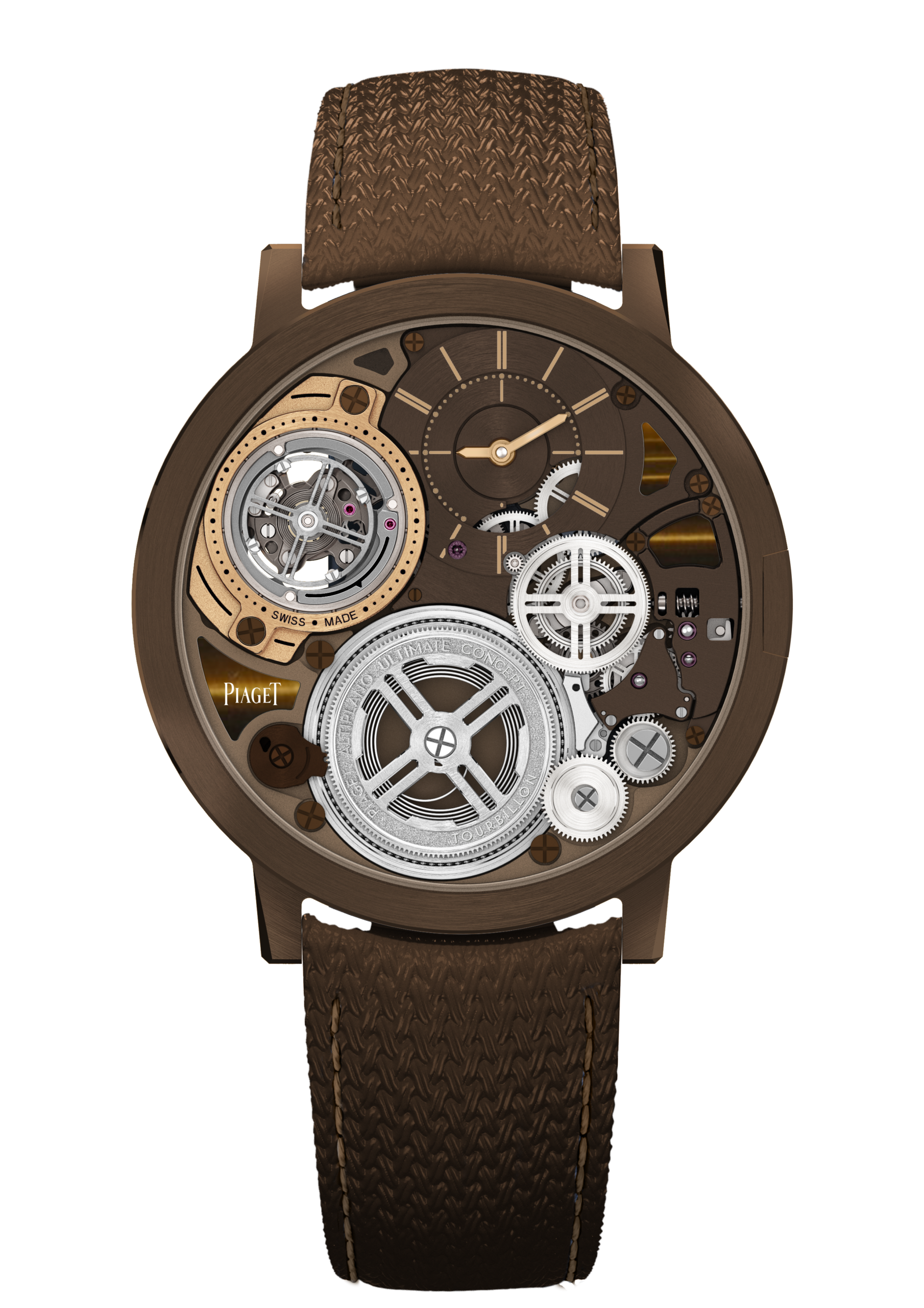 ตัวเรือนอัลลอยโคบอลต์สีน้ำตาลขนาด 41.5 มม. บรรจุกลไกไขลานแบบแมนนวลบางเฉียบรุ่น 970P-UC ของ Piaget Manufacture Tourbillon ซึ่งเป็นกลไกหลักของนาฬิกา Altiplano Ultimate Concept Tourbillon