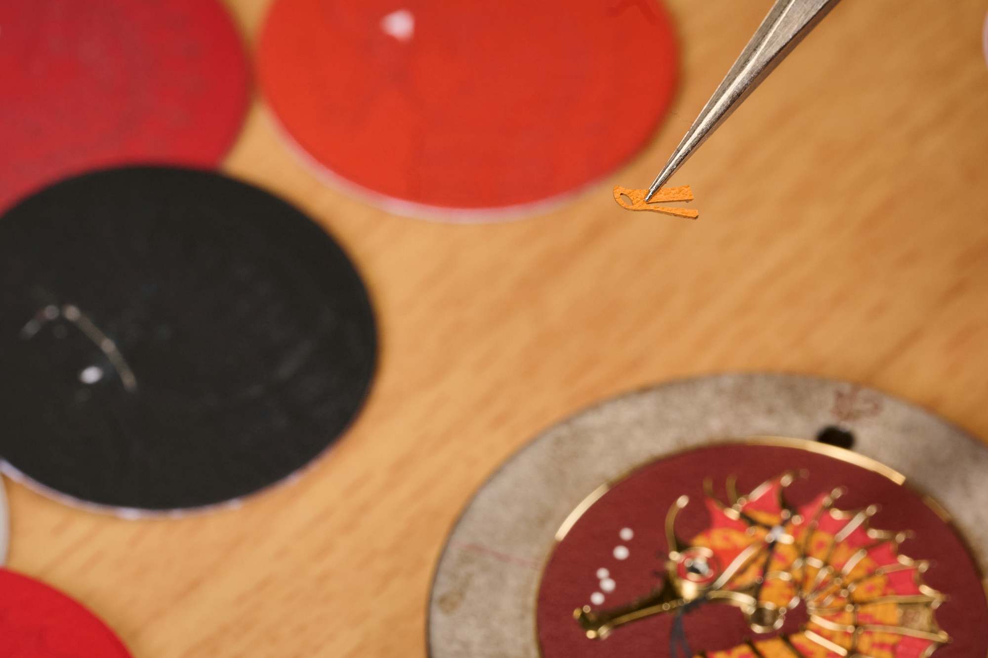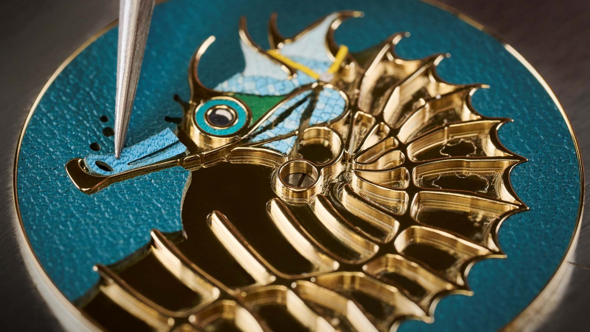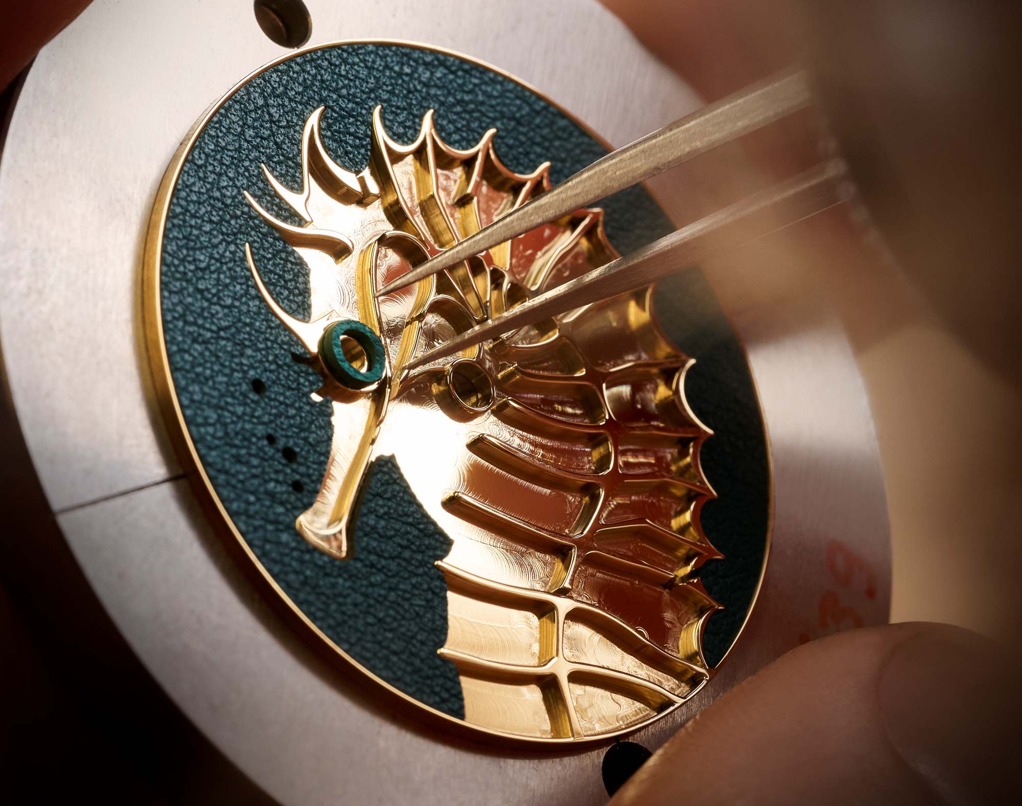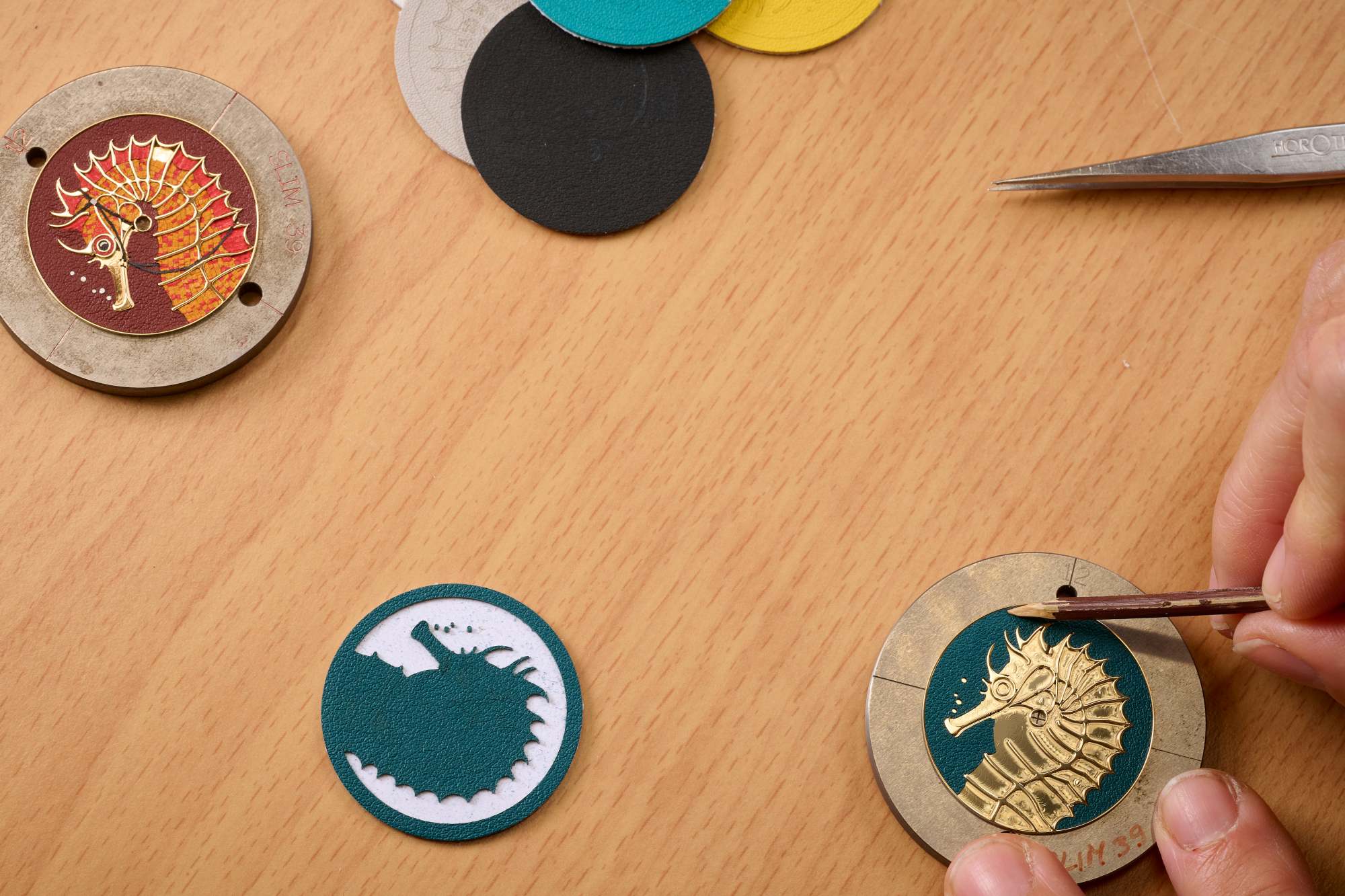 การแปลงรูปร่างโค้งมนของม้าน้ำให้ลงตัวกับหน้าปัดนาฬิกาถือเป็นความท้าทายที่ต้องใช้ความเชี่ยวชาญสูงสุด ช่างแกะสลักคือผู้เริ่มต้นกระบวนการ โดยพวกเขาจะวาดเค้าโครงและกำหนดรูปทรงของม้าน้ำด้วยเครื่องมือหลากหลายชนิด ทำให้เกิดรายละเอียดและความลึกของภาพ หลังจากงานแกะสลักแล้ว จึงเข้าสู่ขั้นตอนที่ต้องอาศัยความละเอียดอ่อนอย่างยิ่งยวดคือ งานต่อลายหนัง