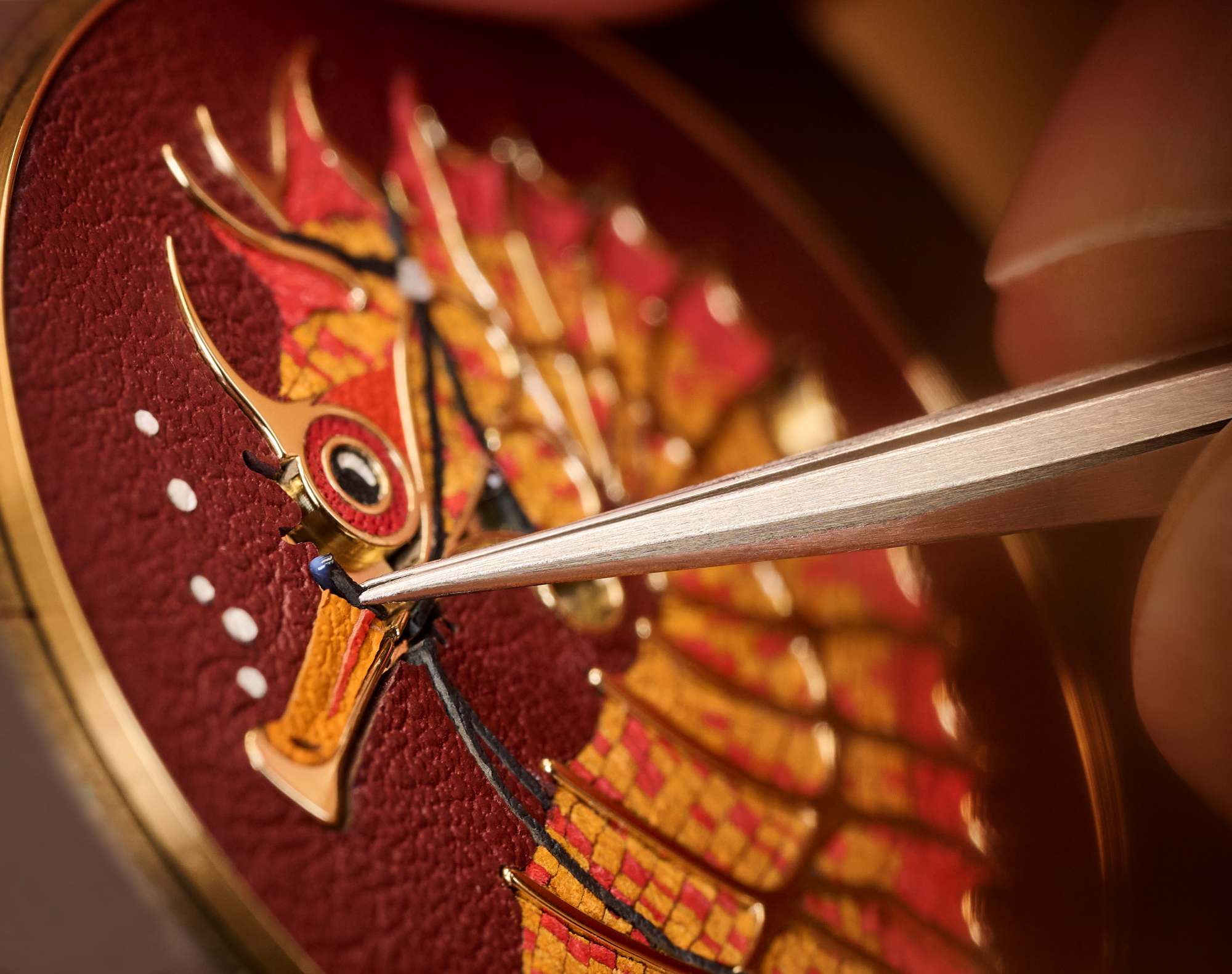Hermès แสดงความเชี่ยวชาญด้านเครื่องหนังที่สั่งสมมาอย่างยาวนาน ด้วยการนำหนังวัว Swift Calfskin ในหลากหลายโทนสีมาเฉือนให้มีความบางเพียง 0.5 มม. ก่อนที่จะนำชิ้นส่วนเล็ก ๆ เหล่านั้นมาตัดอย่างพิถีพิถันเพื่อจำลององค์ประกอบแต่ละส่วนของลวดลาย และนำมาประกอบเข้าบนหน้าปัดทีละชิ้นอย่างประณีตราวกับเป็นโมเสกหนัง งานฝีมือนี้นอกจากจะสร้างมิติที่แตกต่างให้กับพื้นผิวแล้ว ยังช่วยเน้นย้ำรายละเอียดอันน่าอัศจรรย์ของม้าน้ำที่ถูกออกแบบมาให้เต็มไปด้วยพลังและความเคลื่อนไหว