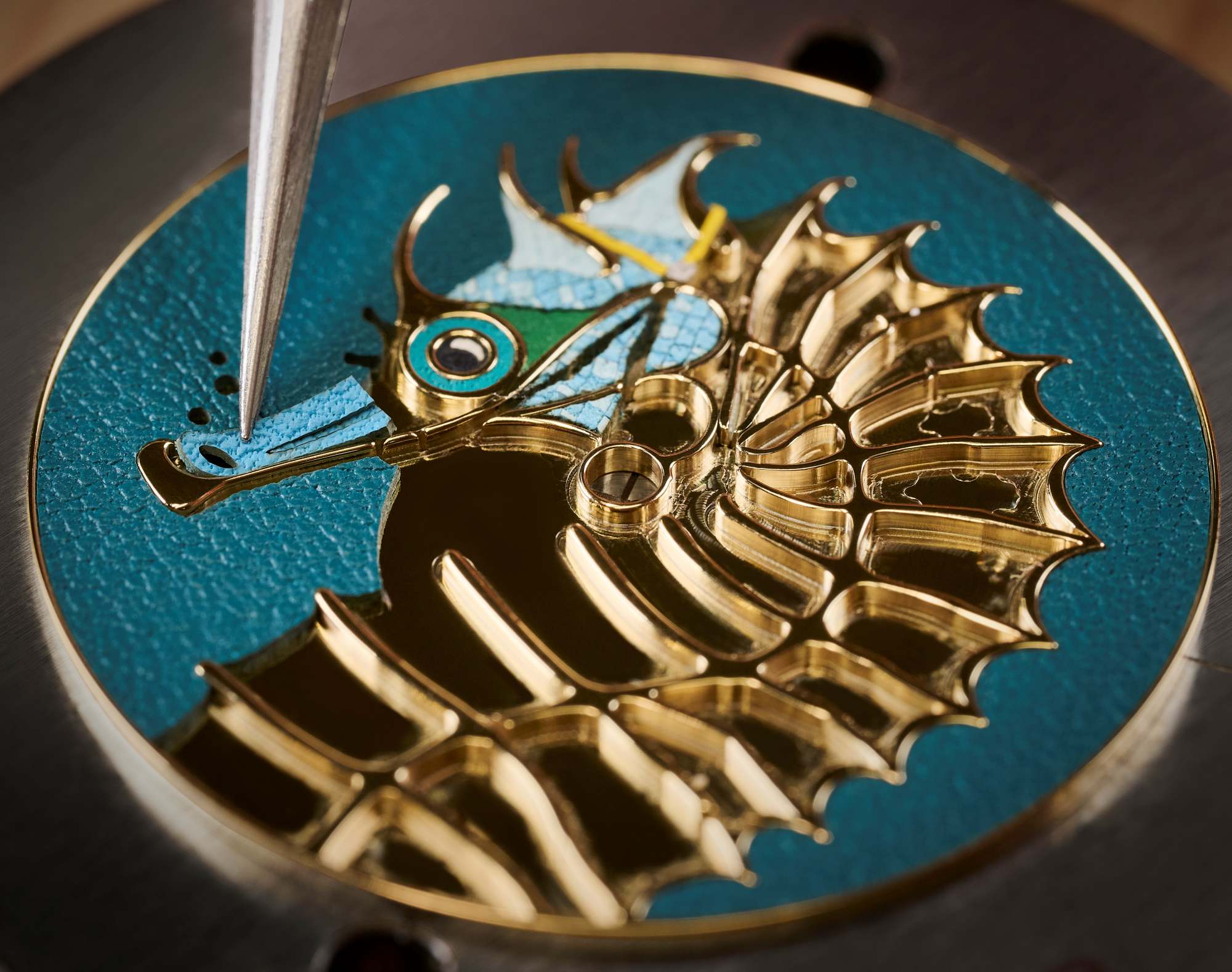 นาฬิกาเรือนนี้สร้างสรรค์ขึ้นด้วยการผสานศิลปะหัตถกรรมชั้นสูงสองแขนงเข้าด้วยกัน นั่นคือ การแกะสลัก (Engraving) และ งานต่อลายหนัง (Leather Marquetry) เพื่อนำพาเจ้าม้าน้ำ ซึ่งเป็นผลงานการออกแบบอันมีชีวิตชีวาของนักวาดภาพประกอบชาวลอนดอน Stuart Patience มาโลดแล่นอยู่บนหน้าปัดขนาดกะทัดรัด