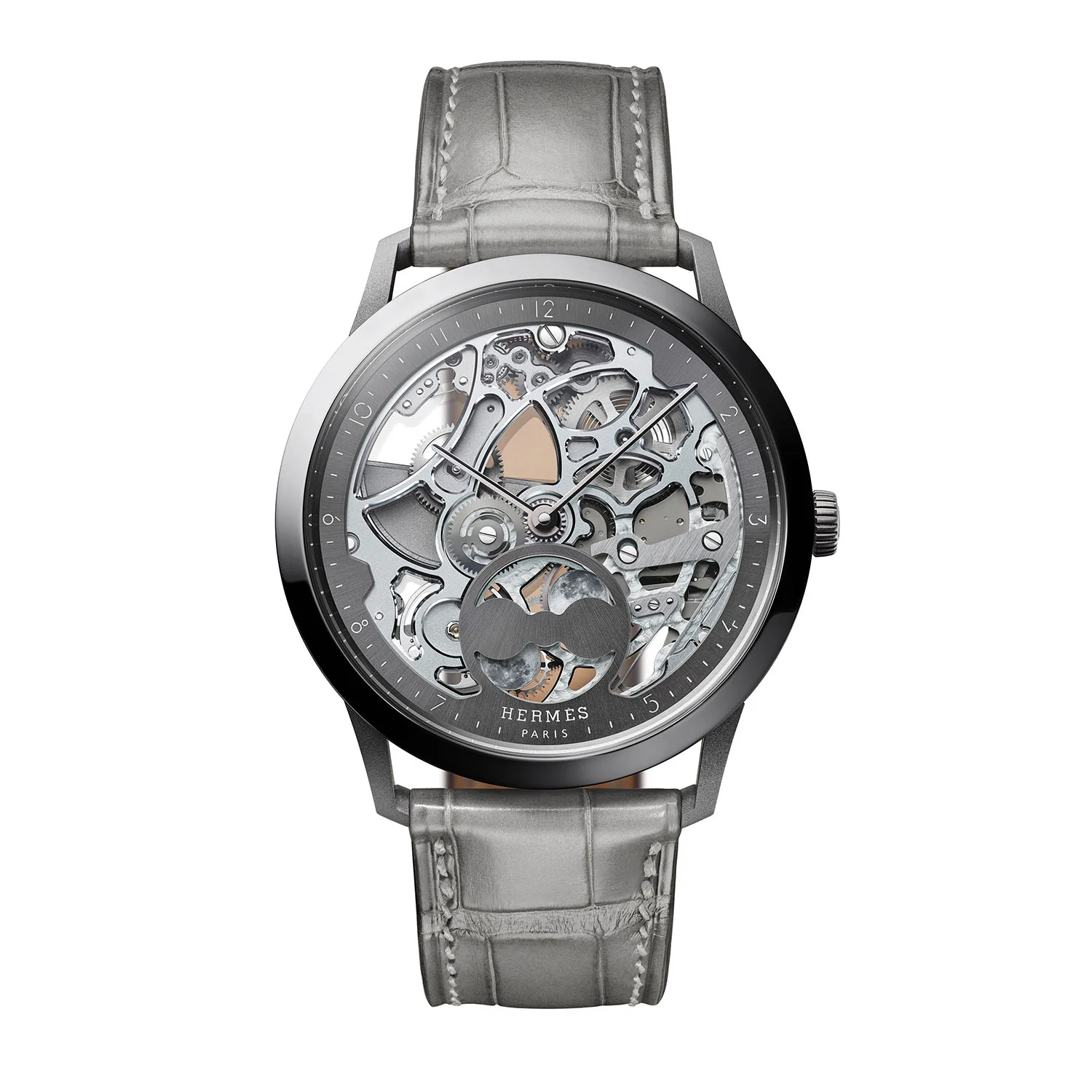 สำหรับ Hermès เวลาคือวัตถุแห่งจินตนาการที่มีชีวิตและจิตวิญญาณ ซึ่งก้าวข้ามการเป็นเพียงตัวเลขที่เคลื่อนผ่านไป โดยเฉพาะในคอลเลกชัน Slim d’Hermès ที่ถือกำเนิดขึ้นในปี 2015 ด้วยลายเส้นที่เฉียบคมและตัวเลขแบบอักษรเฉพาะตัวผลงานของ Philippe Apeloig และในปี 2026 นี้ Hermès ได้ยกระดับความซับซ้อนไปอีกขั้นด้วยการเปิดตัว Slim d’Hermès Squelette Lune ในวัสดุใหมอย่างไทเทเนียมและแพลทินัม ที่เน้นการโชว์โครงสร้างภายในที่โปร่งเบาและการเคลื่อนคล้อยของดวงจันทร์คู่