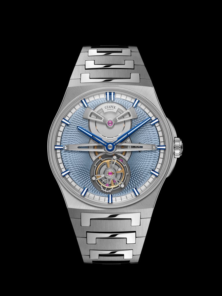 นาฬิกาสไตล์สปอร์ตชิค Antarctique Tourbillon นี้สมกับที่เป็นผลงานครอบรอบ 10 ปีการกลับมาของ Czapek และยังตรงกับวาระ ครบรอบ 180 ปี ของแบรนด์ด้วย ดีไซน์โดดเด่นงดงามทั้งด้านงานฝีมือและด้านเทคนิค ตัวเรือนครอบด้วยกระจกแซฟไฟร์ทรงกล่องทั้งด้านหน้าและด้านหลัง ทำงานด้วยกลไก Czapek Calibre 9 โดยตั้งใจออกแบบ ให้ทูร์บิญอง ชุดเฟือง และตลับลานปรากฏอยู่บนหน้าปัด เรียงตัวอย่างสมบูรณ์บนแกนตั้ง และให้ความรู้สึกโปร่งเบาที่สุด โดยฟลายอิ้งทูร์บิญองแบบเปิดโครงสร้างปรากฏเหมือนลอยอยู่ระหว่างเพลตหลักกับหน้าปัด เชื่อมต่อโดยตรงกับชุดเฟืองที่ลอยอยู่กลางหน้าปัด ส่วนตลับลานครองพื้นที่ด้านบนของหน้าปัด ลอยอยู่ในช่องเปิดใต้สะพานเปิดโครงสร้าง สร้างความสมดุลระหว่างความซับซ้อนทางเทคนิคและความงดงาม