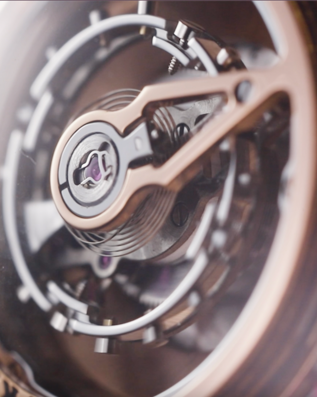 หัวใจของนาฬิกาสุดพิเศษเรือนนี้คือฟลายอิ้งทูร์บิญองซึ่งทำงานอย่างแม่นยำและเสถียร ทั้งยังมีระบบกันกระแทกล้ำสมัยตรงบริเวณฐานของกลไก จึงดูดซับแรงกระแทกและรับประกันความแข็งแรงทนทาน ทำให้ผลงานนี้สวมใส่ในชีวิตประจำวัน แตกต่างจากทูร์บิญองแบบดั้งเดิมที่มักถูกมองว่าบอบบาง อีกทั้งการใช้ไทเทเนียมและอะลูมิเนียมช่วยให้ ตัวเรือนมีน้ำหนักเบาและแข็งแรง พร้อมเพิ่มประสิทธิภาพ และความสบายในการสวมใส่บนข้อมือ