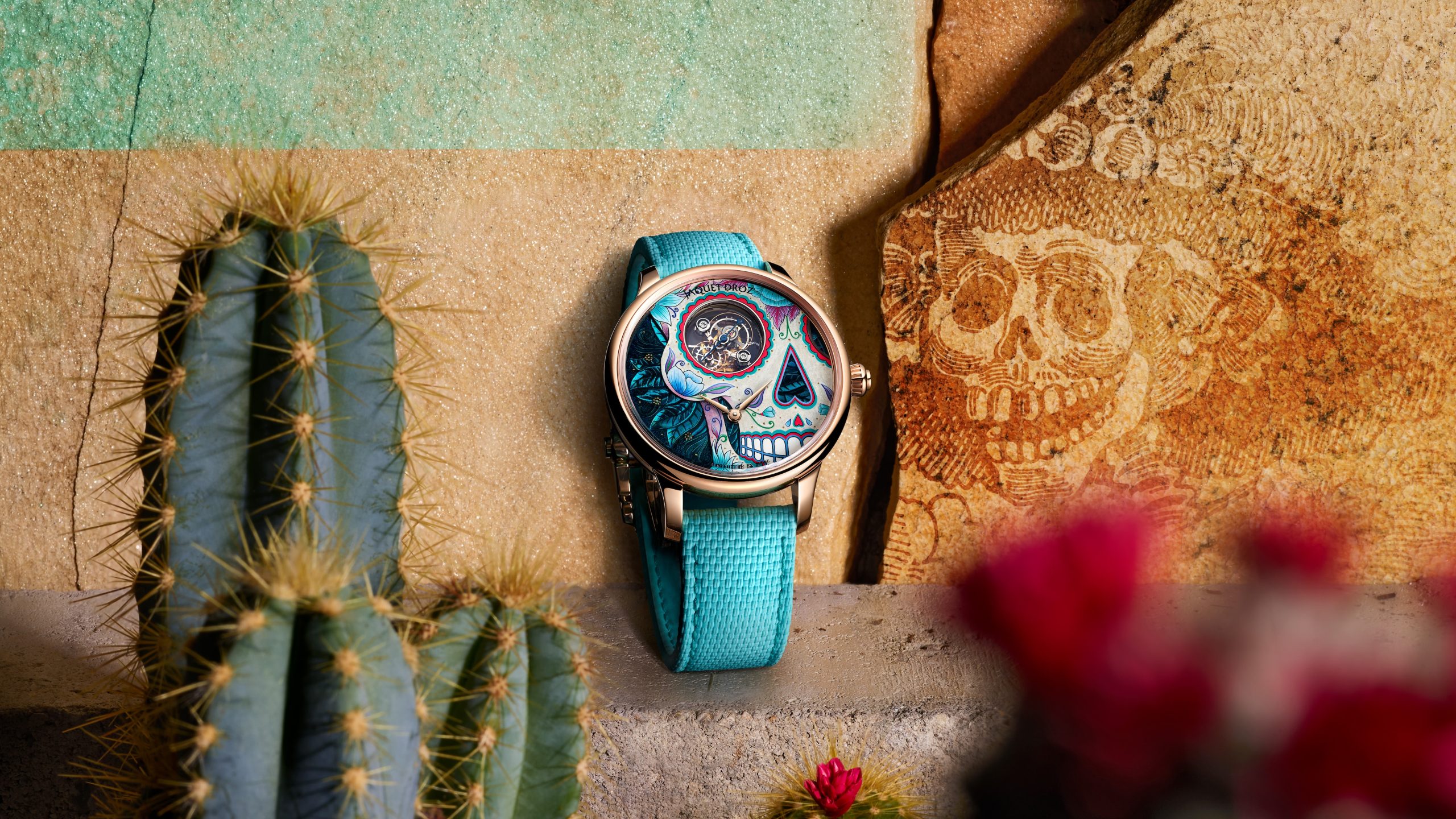 Jaquet Droz เปิดตัวนาฬิกาเรือนพิเศษ Catrina Skull ที่อุทิศให้กับ ตัวละครหญิงเพียงไม่กี่ตัวของ ‘ความตาย’ ในเทศกาล Día de Muertos ของเม็กซิโก โดยนำเสนอในตัวเรือนเรดโกลด์ 39 มม. ผสานเทคนิค micro-painting, paillonné และ grand feu enamel อย่างชำนาญ เพื่อถ่ายทอดความซับซ้อนและความมีชีวิตชีวาของตัวละคร Catrina ซึ่งปรากฏบนหน้าปัดด้านขวา