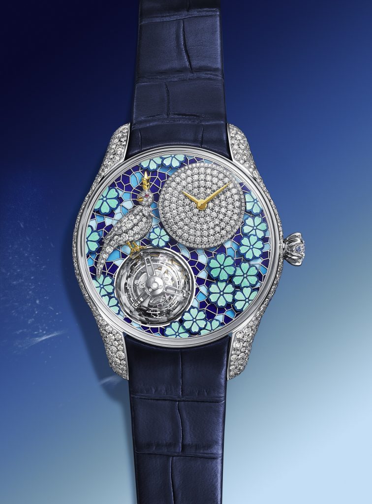 ช่วงหลังๆ มานี้ เราได้เห็น Tiffany & Co. หันมาลุยตลาดนาฬิกาชั้นสูงมากขึ้น อย่างผลงานล่าสุด Bird on a Flying Tourbillon Azure Blossom ซึ่งที่ต่อยอดมาจากนาฬิกากลไกฟลายอิ้งทูร์บิญองเรือนแรกจากเข็มกลัด Bird on a Rock ที่ Jean Schlumberger ออกแบบให้ Tiffany & Co. ในปี 1965