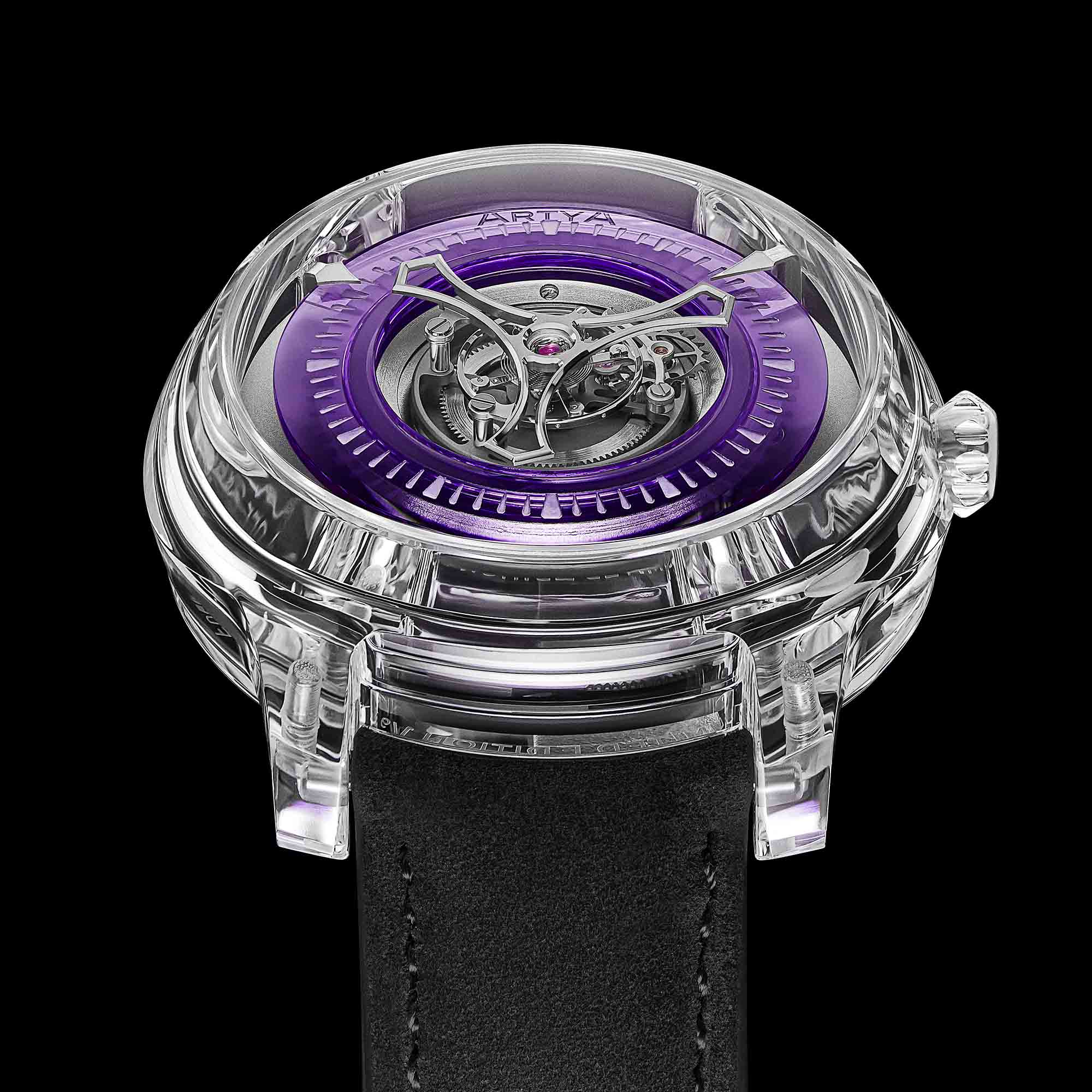 กลไกคาลิเบอร์เซ็นทรัลทูร์บิญองซึ่งเคยได้รับการเสนอชื่อเข้าชิงรางวัล Grand Prix d’Horlogerie เมื่อปี 2024 ได้หวนกลับมาในรูปโฉมใหม่ในชื่อ Purity Wavy Central Tourbillon Purple 40 mm โดดเด่นสะดุดตาด้วยชิ้นแซฟไฟร์สีม่วงกลางหน้าปัด พร้อมทูร์บิญองโอเวอร์ไซส์ 19 มม. แถมกลไกยังทำที่ความถี่ 4 เฮิรตซ์ (28,800 ครั้งต่อชั่วโมง) ซึ่งถือเป็นความสำเร็จที่หาได้ยากสำหรับทูร์บิญองขนาดนี้ พร้อมบาร์เรลคู่ที่ทำงานประสานกันเพื่อส่งแรงบิดที่เพียงพอสำหรับพลังงานสำรอง 72 ชั่วโมง