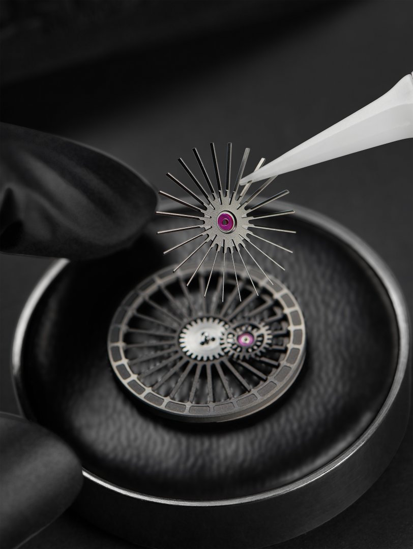 ในเมื่อฟังก์ชันเต็มไปด้วยความซับซ้อนสูงกลไกที่ขับเคลื่อนก็ย่อมไม่ธรรมดา ตามที่ Felix Baumgartner ได้อธิบายไว้ว่า กลไกขับเคลื่อน UR-10 SpaceMeter นั้นเป็นการพัฒนาผ่านความร่วมมือระหว่าง Vaucher Manufacture เพื่อให้ตอบโจทย์ฟังก์ชันและดีไซน์ที่เรียบง่ายได้อย่างลงตัวที่สุด ซึ่งต้องเผชิญหน้ากับความท้าทายด้านการบริหารจัดการน้ำหนักและพลังงาน โดยเลือกคงไว้เฉพาะสิ่งที่จำเป็นเพื่อให้ได้น้ำหนักเบา แต่มอบพลังงานที่ทรงประสิทธิภาพ กลไกนี้จึงเลือกใช้เฟืองห้าแกนหมุนบนทับทิมเพื่อลดแรงเสียดทาน พร้อมระบบควบคุมพลังงานที่เสถียร สามารถถ่ายทอดจังหวะการทำงานสองแบบในกลไกเดียว การเลือกใช้เฟืองแบบสเกเลตันทำให้ได้น้ำหนักเบาเพียงแค่ 0.015 – 0.009 กรัม หรือเบาหวิวเทียบเท่าขนตาหนึ่งเส้นเท่านั้นเอง จึงสามารถประหยัดพลังงานสูงสุดแต่ยังคงความแม่นยำและทรงพลัง