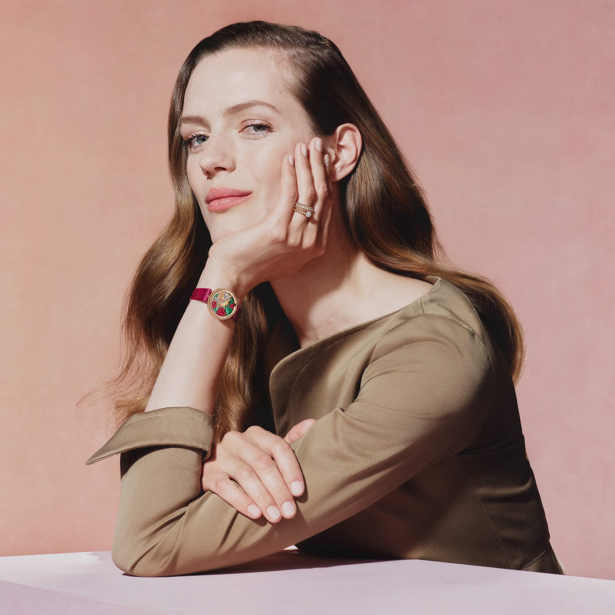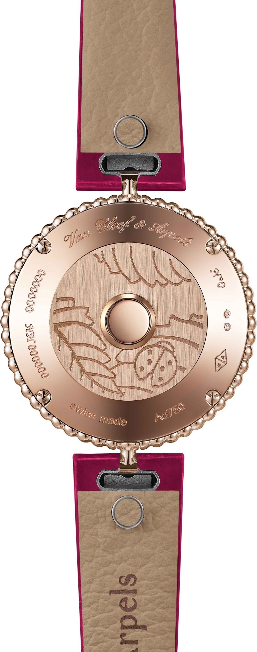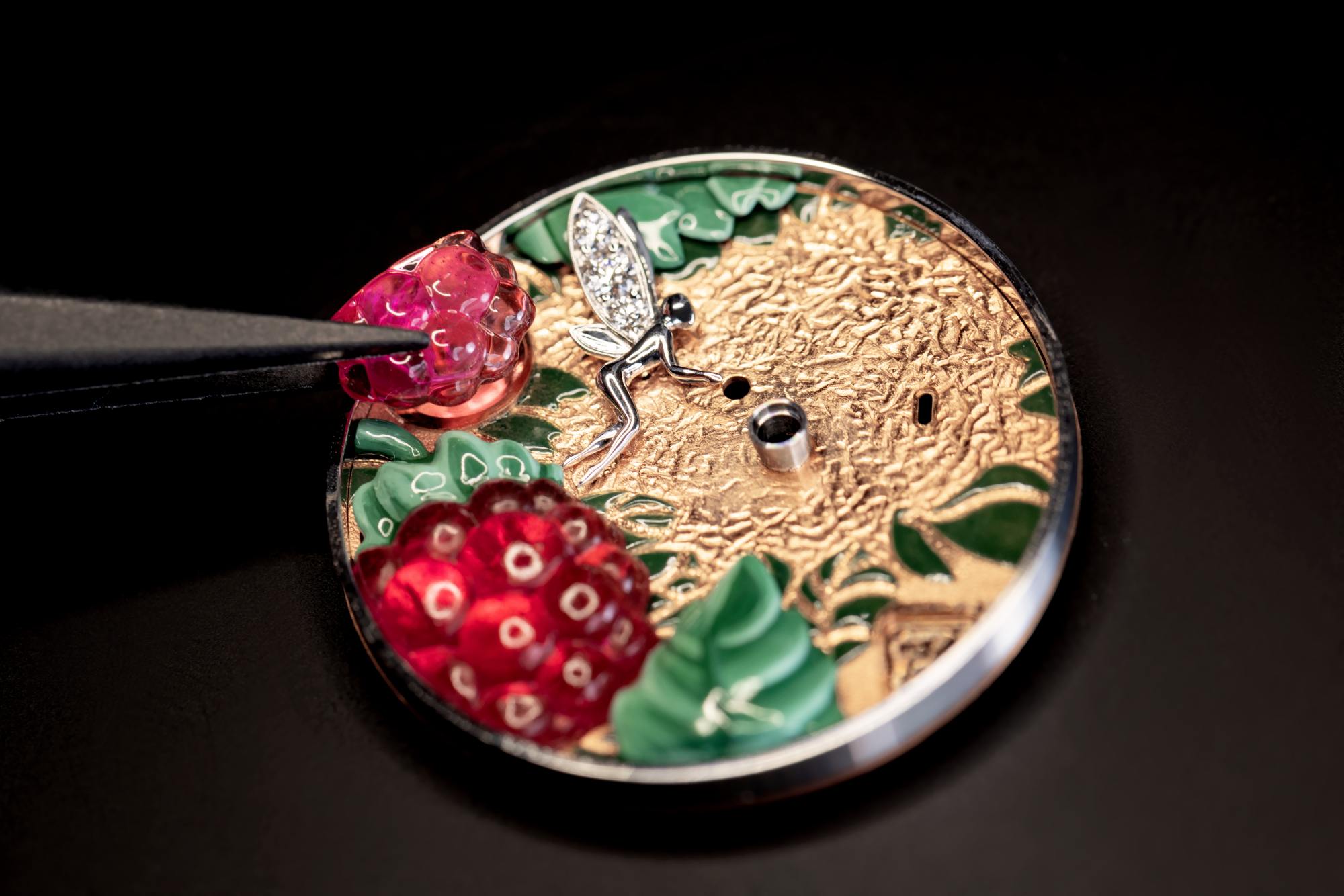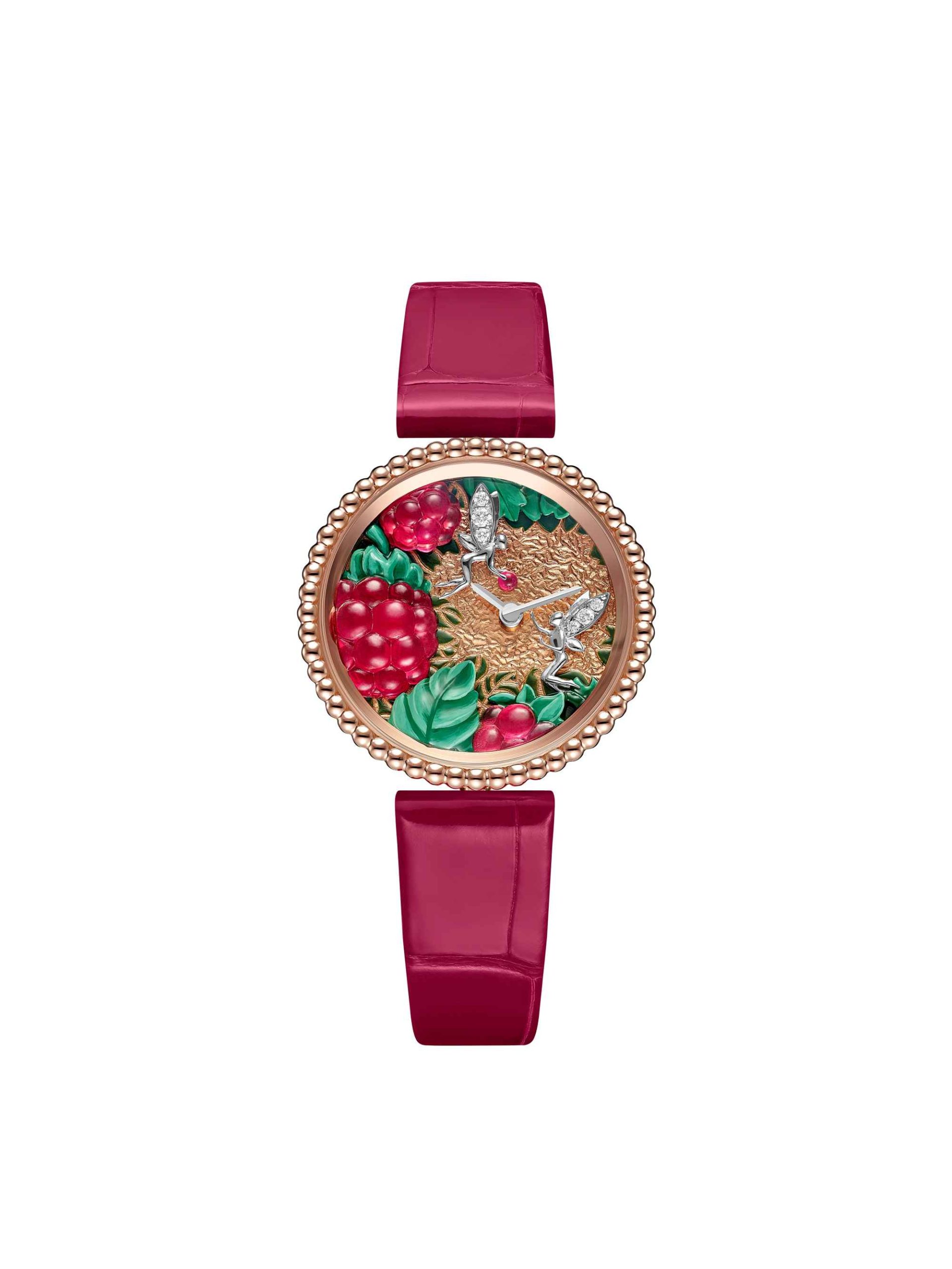 สำหรับรุ่น Framboise สะท้อนถึงความอ่อนหวานของราสพ์เบอร์รีด้วยตัวเรือนไวท์โกลด์และโรสโกลด์ ผลราสพ์เบอร์รีลงยาสีชมพูระเรื่อถูกรังสรรค์ขึ้นอย่างละเอียดอ่อน ทำให้ดูเหมือนผลไม้สุกฉ่ำที่น่าลิ้มลอง รายล้อมด้วยใบไม้สีเขียวอ่อนที่ให้ความรู้สึกสดชื่น ประติมากรรมนางฟ้าที่ประดับอยู่บนหน้าปัดทำจากทองไวท์โกลด์พร้อมปีกฝังเพชรที่เปล่งประกาย ในขณะที่ฝาหลังของตัวเรือนสลักลายแมลงเต่าทองไว้ เป็นการเติมเต็มเรื่องราวจากธรรมชาติให้สมบูรณ์
