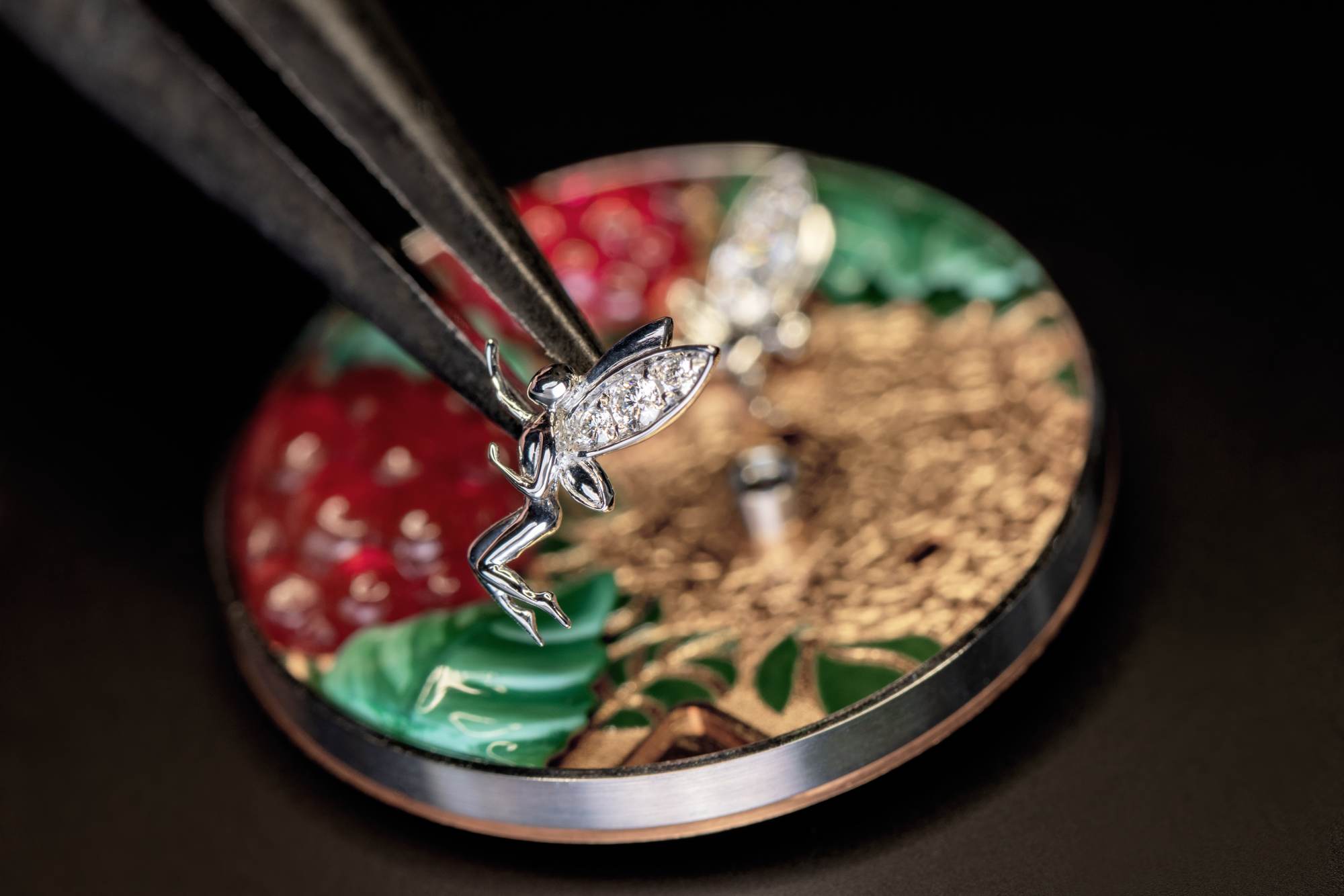 - หน้าปัด: ตกแต่งด้วยงานลงยาราสพ์เบอร์รี จิตรกรรมย่อส่วนใบไม้ ประติมากรรมนางฟ้าไวท์โกลด์ฝังเพชร