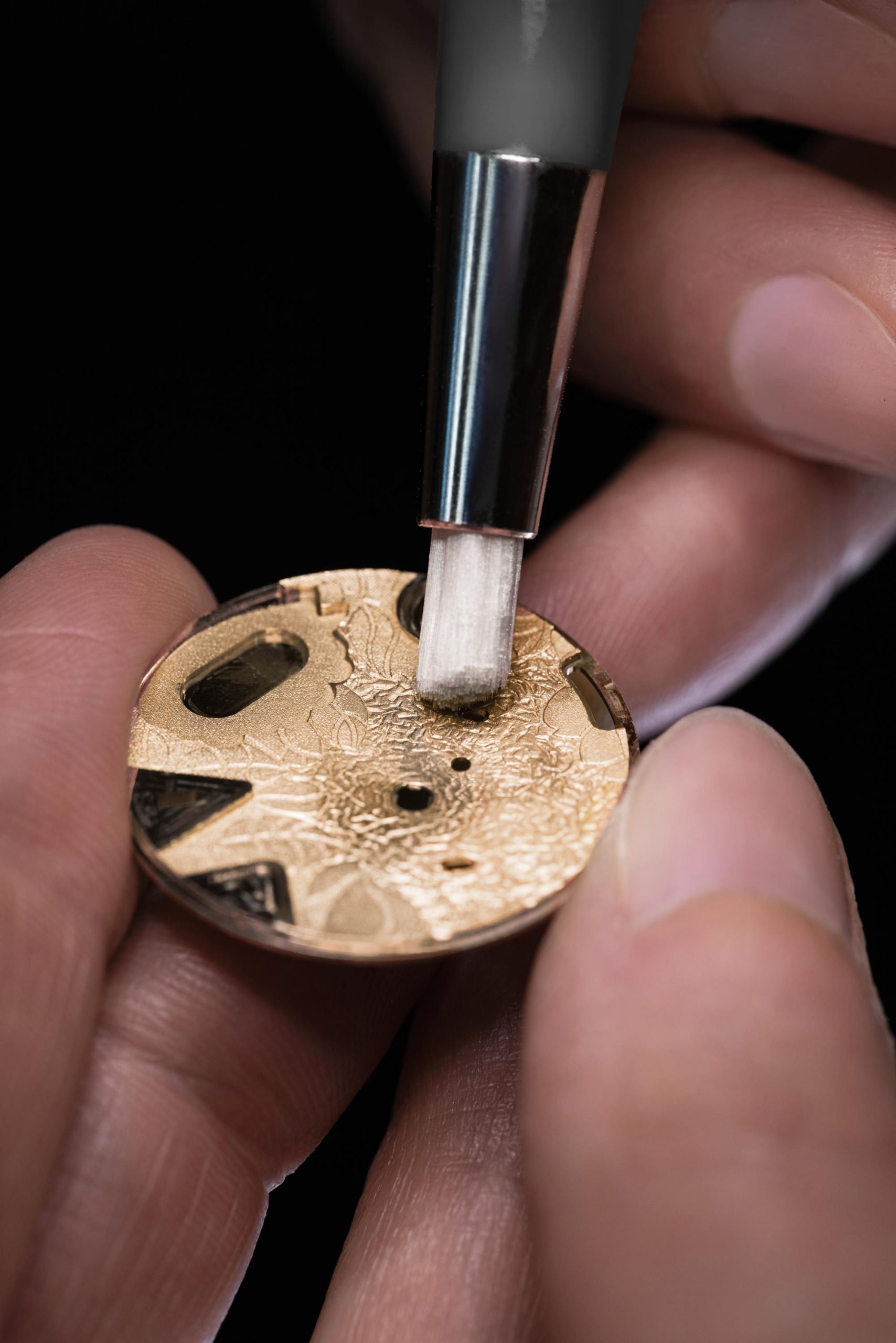 นอกจากงานลงยาแล้ว นาฬิกาในคอลเลกชันนี้ยังผสมผสานงานฝีมือเครื่องทองแบบดั้งเดิมเข้าด้วยกันอย่างลงตัว ไม่ว่าจะเป็นประติมากรรมทองคำ และงานค้อนดุนลายบนเนื้อทอง ซึ่งล้วนต้องอาศัยความอดทนและความแม่นยำสูง ยกตัวอย่างเช่น ประติมากรรมรูปนางฟ้าบนหน้าปัดที่ต้องผ่านกระบวนการขึ้นรูปด้วยไขแว็กซ์และหล่อด้วยโลหะเงินก่อน เพื่อให้ได้โครงสร้างที่สมบูรณ์แบบที่สุด
