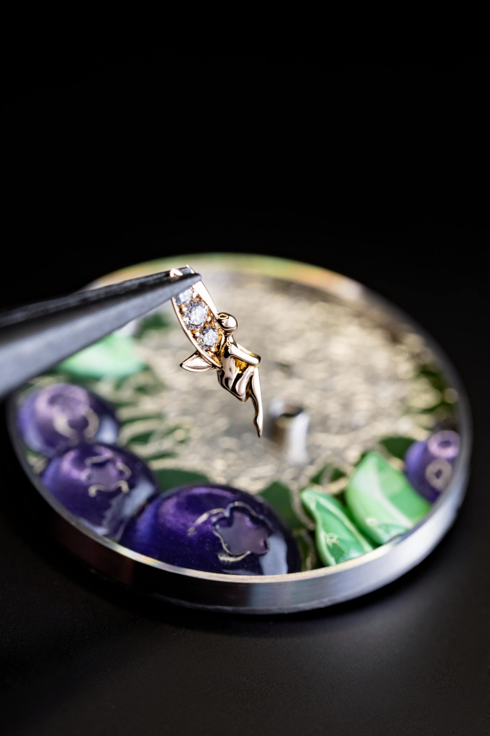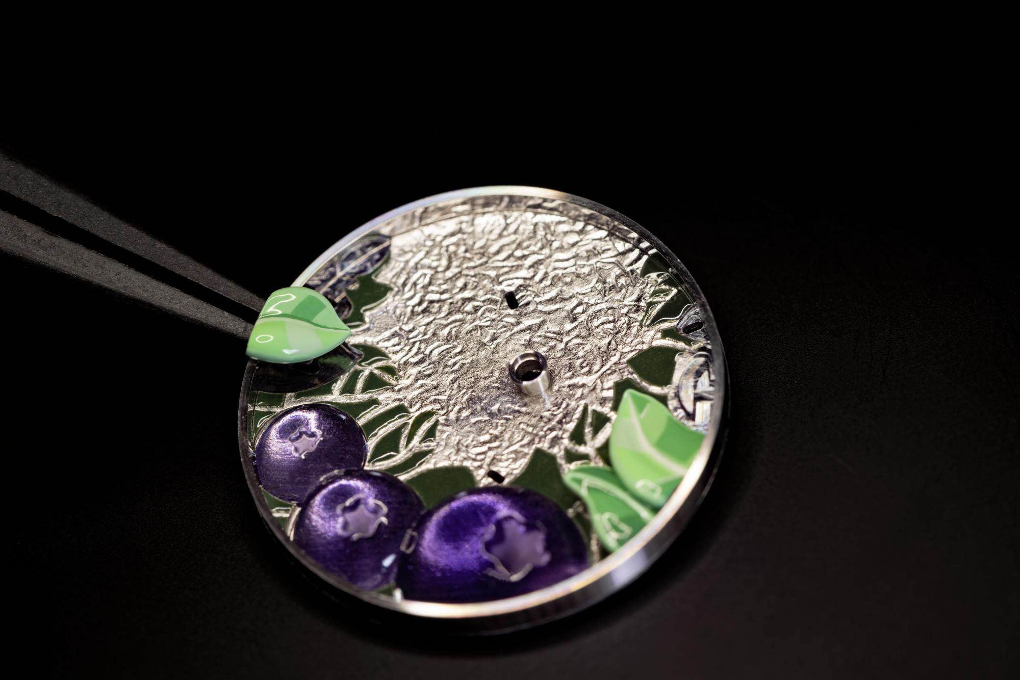 - หน้าปัด: ตกแต่งด้วยงานลงยาบลูเบอร์รี จิตรกรรมย่อส่วนใบไม้ ประติมากรรมนางฟ้าโรสโกลด์ฝังเพชร