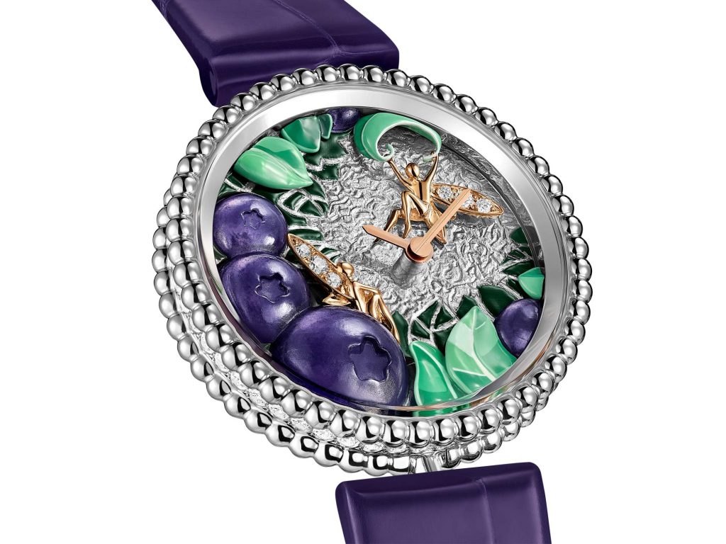 เรือนเวลา Myrtille ถ่ายทอดความงดงามของบลูเบอร์รีได้อย่างมีชีวิตชีวา ตัวเรือนทำจากไวท์โกลด์และโรสโกลด์ หน้าปัดประดับด้วยผลบลูเบอร์รีลงยาสีน้ำเงินเข้มข้นที่ดูราวกับผลจริงที่พร้อมให้เก็บเกี่ยว อยู่ท่ามกลางใบไม้สีเขียวอ่อนที่ถูกวาดด้วยเทคนิคจิตรกรรมย่อส่วนและงานดุนลายบนทองคำ ประติมากรรมนางฟ้าที่ทำจากโรสโกลด์พร้อมปีกฝังเพชรดูเหมือนกำลังโบยบินอยู่บนหน้าปัดอย่างอ่อนช้อย นอกจากนี้ ที่ฝาหลังของตัวเรือนยังสลักลายผีเสื้อไว้เพื่อเพิ่มเสน่ห์ให้กับนาฬิกาเรือนนี้อีกด้วย