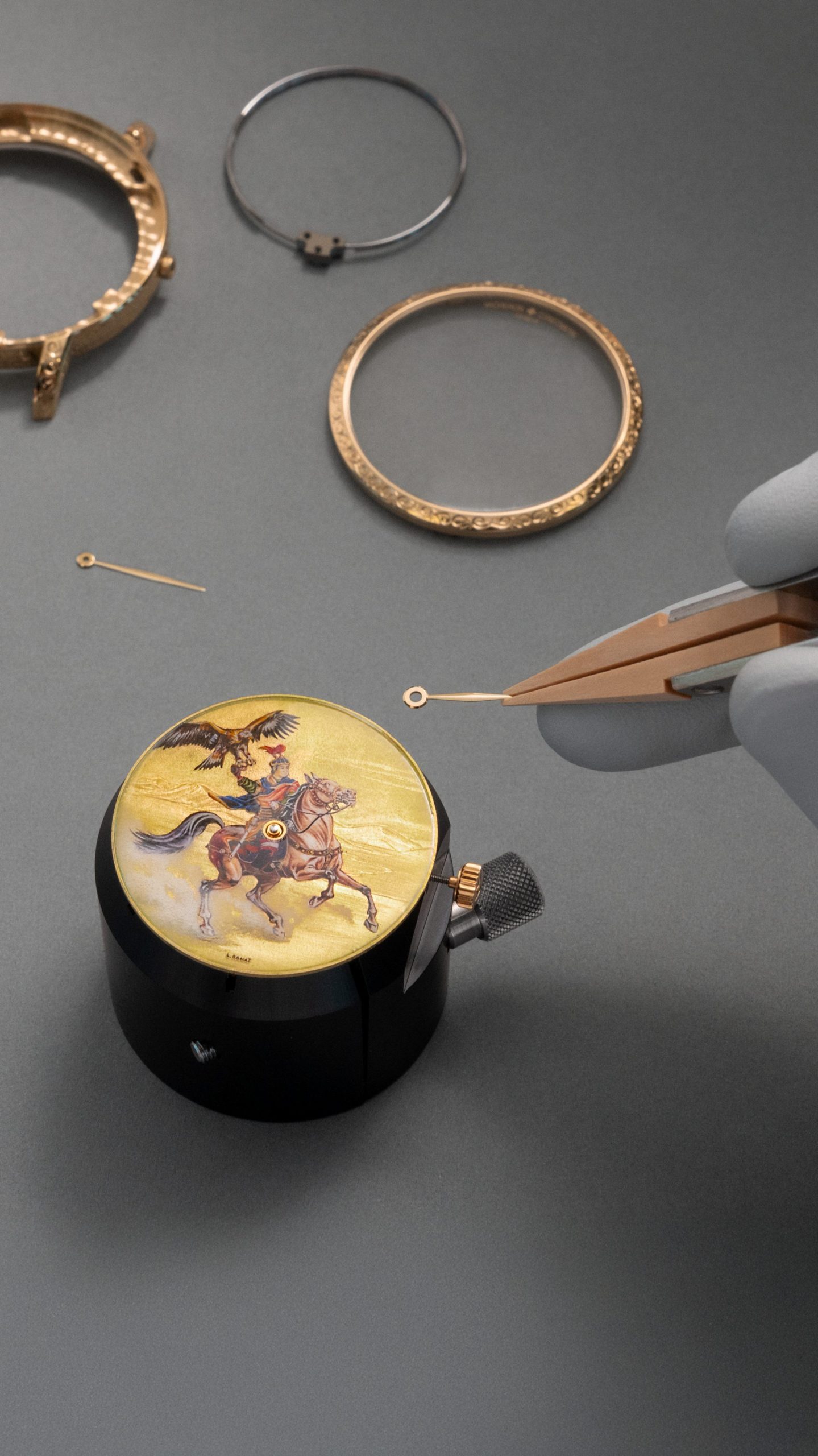 - การวาดภาพขนาดจิ๋วลงยาแบบกรองด์ เฟอ (Grand Feu Miniature Enamel): ภาพวาดของวีรบุรุษถูกรังสรรค์อย่างละเอียดบนหน้าปัด โดยใช้เทคนิคการเคลือบสลับสี 6-7 ชั้น และผ่านการเผาที่อุณหภูมิสูง (800-900°C) หลังการลงยาแต่ละชั้น ซึ่งใช้เวลาประมาณ 120 ชั่วโมงต่อหน้าปัด