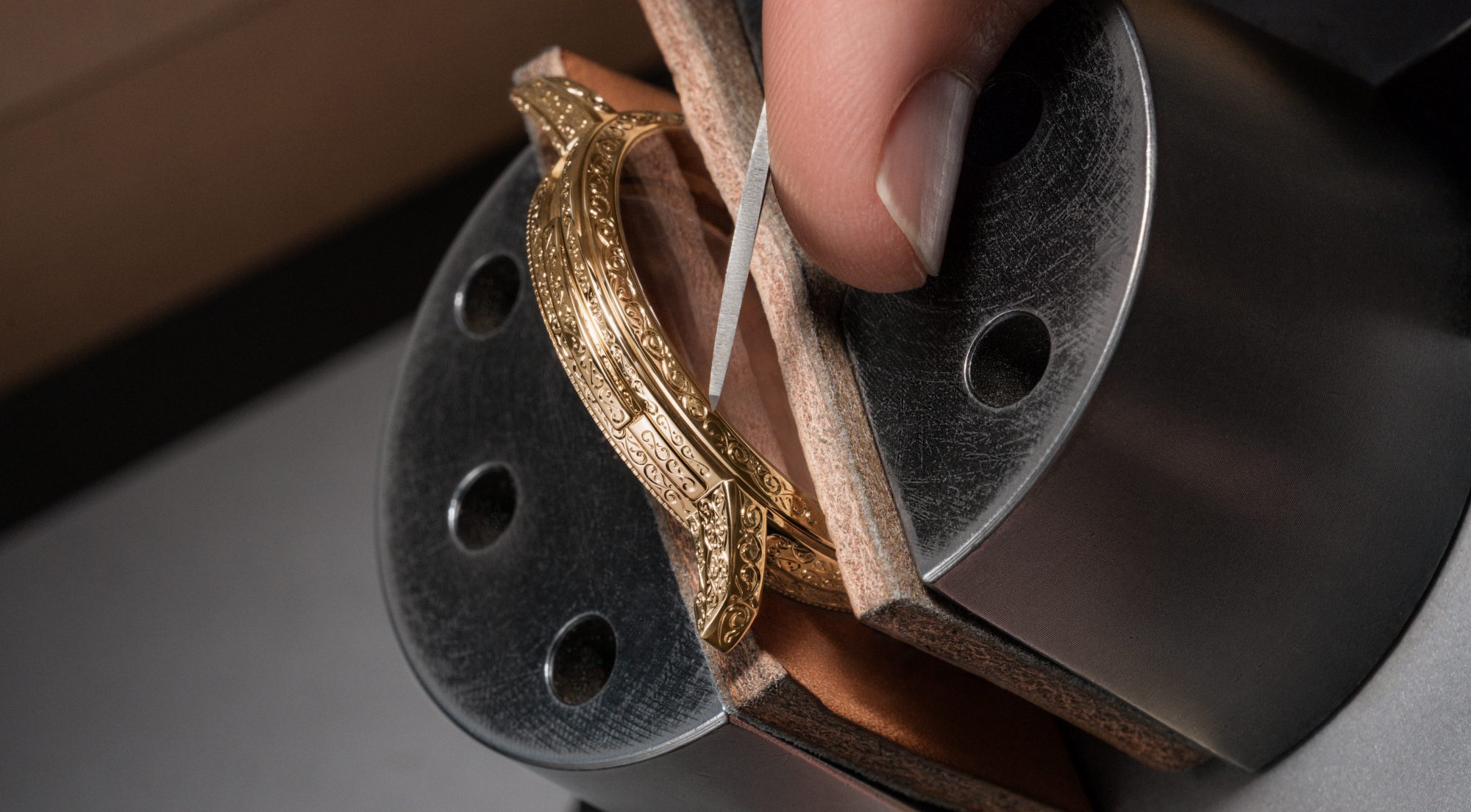 - หัตถศิลป์และหน้าปัด: หน้าปัดทองคำ 18K 2N Yellow Gold ผสมผสานงานหัตถศิลป์หายากสองแขนง: