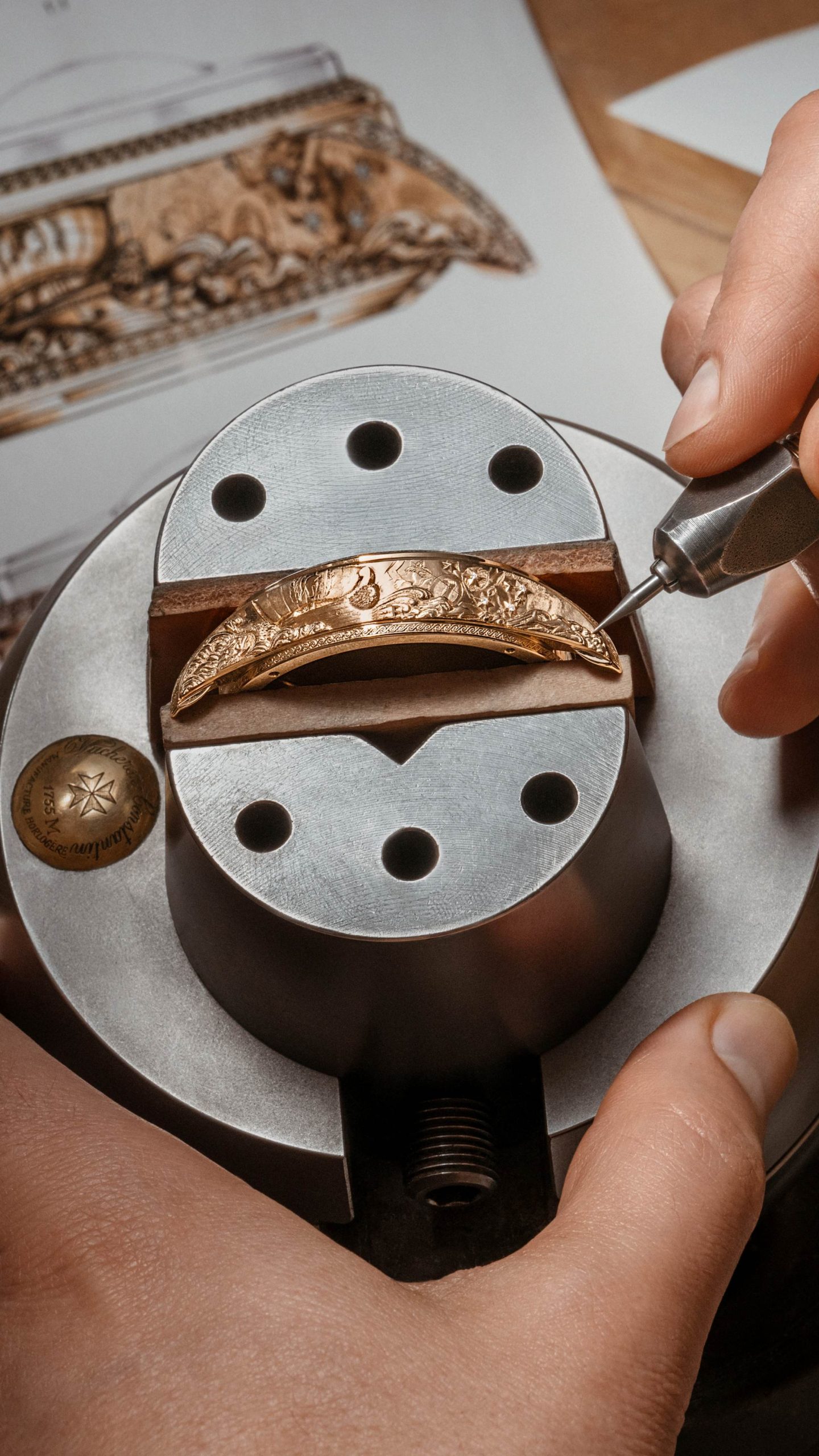 - การแกะสลักด้วยมือ (Hand-engraving): พื้นหลังหน้าปัดถูกแกะสลักด้วยมืออย่างประณีตด้วยผิวแบบด้านและแบบมันวาว เพื่อสื่อถึงภูมิทัศน์ที่นักรบได้ทำวีรกรรมสำคัญ นอกจากนี้ ตัวเรือนขนาด 41 มม. และหัวเข็มขัดยังถูกแกะสลักด้วยมืออย่างเต็มรูปแบบโดยใช้เทคนิค taille-douce (การแกะลายเส้น) ซึ่งต้องใช้เวลาประมาณ 160 ชั่วโมงต่อตัวเรือน