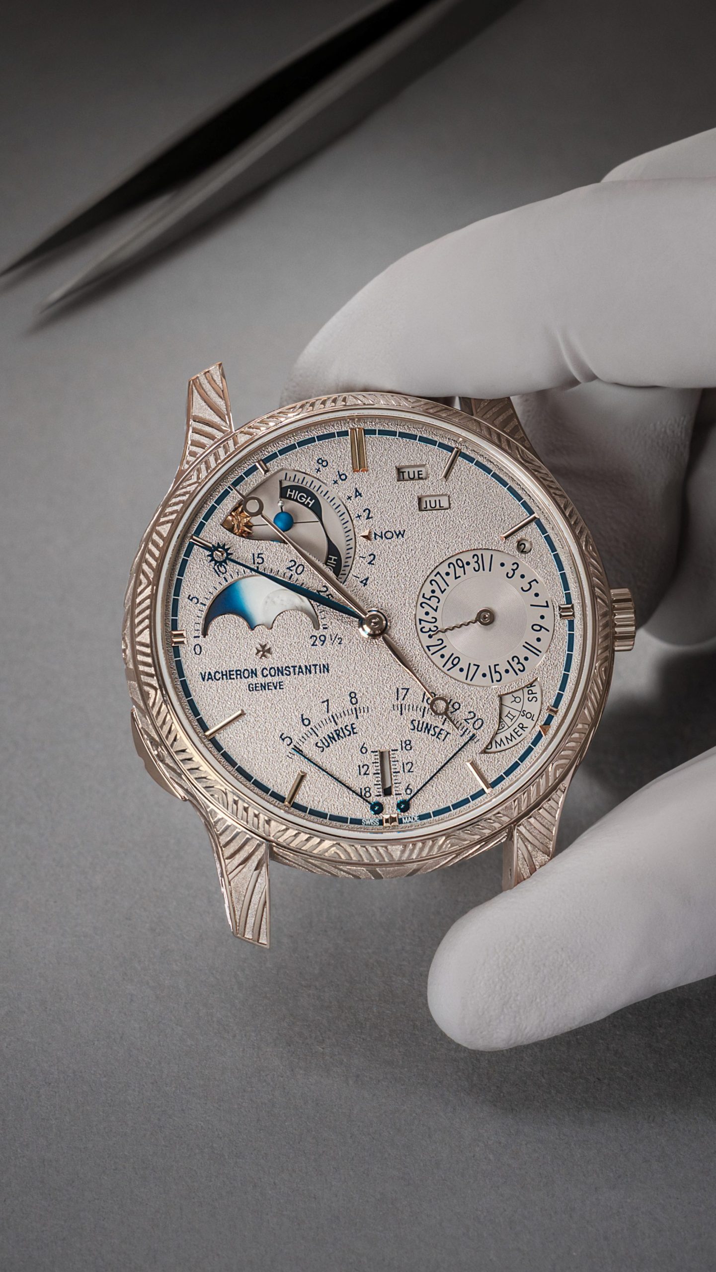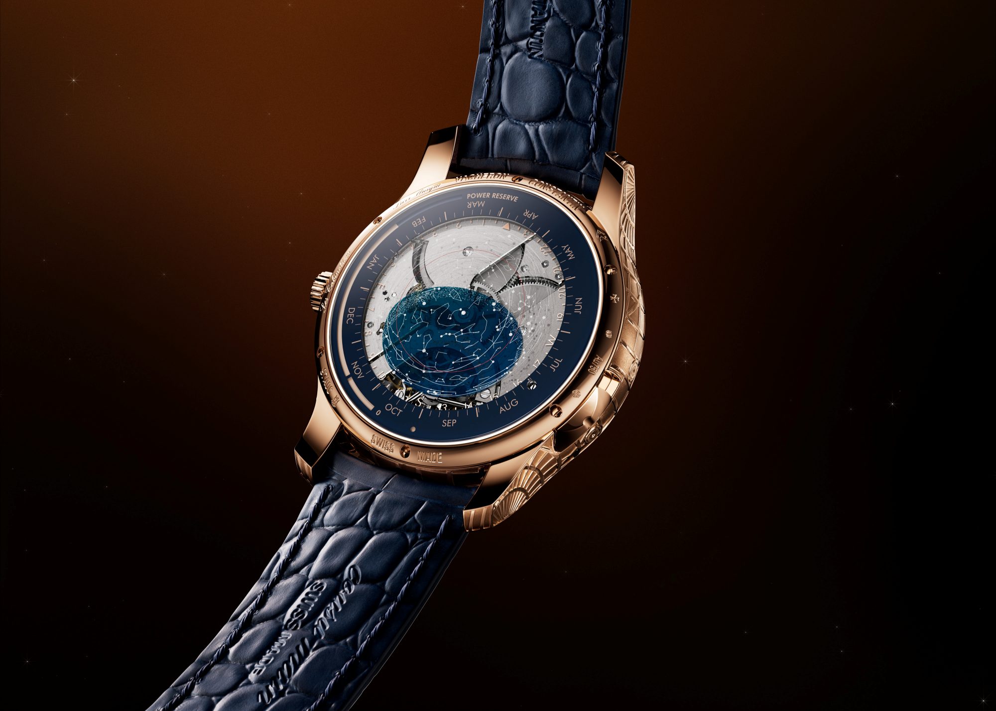 - การออกแบบ: ตัวเรือนไวท์โกลด์ขนาด 47 มม. ที่มีการออกแบบตามหลักสรีรศาสตร์ พร้อมหูสายแบบข้อต่อที่สามารถถอดและยึดสายได้ทั้งสองด้านโดยไม่ต้องใช้เครื่องมือ หน้าปัดด้านหนึ่งเป็นสีน้ำเงินอัลตร้ามารีน พร้อมแผนที่ดาวบางเฉียบ (0.25 มม.) ส่วนอีกด้านหนึ่งเปิดเปลือยให้เห็นความงามเชิงกลไก